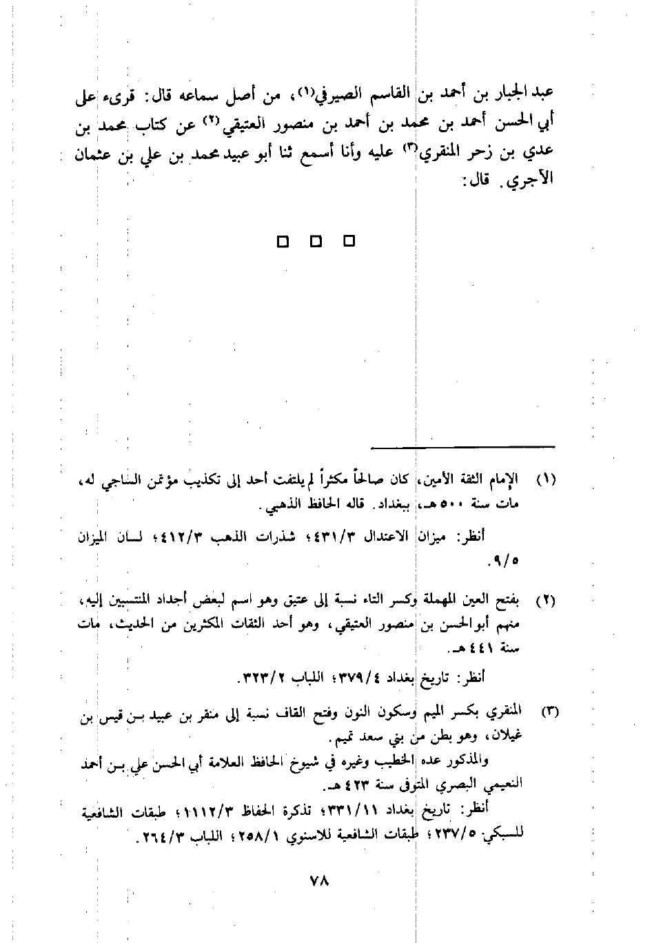 عَبْدِ الْجَبَّارِ بْنِ أَحْمَدَ بْنِ القاسم الصيرفي1، من أصل سماعه قال: قرئ على أبي الْحَسَنِ أَحْمَدُ بْنُ مُحَمَّدِ بْنِ أحمد بن منصور العتيقي2 عن كتاب محمد بن عدي بن زحر المنقري3 عليه وأنا أسمع ثنا أبو عبيد محمد ابن عَلِيِّ بْنِ عُثْمَانَ الآجُرِّيُّ قَالَ: