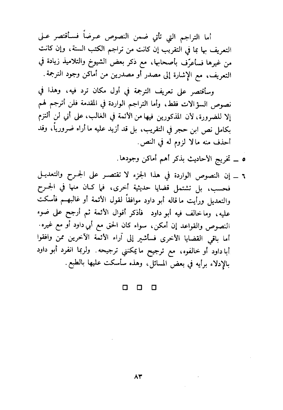6- إن النصوص الواردة في هذا الجزء لا تقتصر على الجرح والتعديل فحسب، بل تشتمل قضايا حديثية أخرى، فما كان منها في الجرح والتعديل ورأيت ما قاله أبو داود موافقاً لقول الأئمة أو غالبهم فأسكت عليه، وما خالف فيه أبو داود فأذكر أقوال الأئمة ثم أرجح على ضوء النصوص والقواعد إن أمكن، سواء كان الحق مع أبي داود أو مع غيره. أما باقي القضايا الأخرى فسأشير إلى آراء الأئمة الآخرين ممن وافقوا أبا داود أو خالفوه، مع ترجيح ما يمكنني ترجيحه. ولربما انفرد أبو داود بالإدلاء برأيه في بعض المسائل، وهذه سأسكت عليها بالطبع.