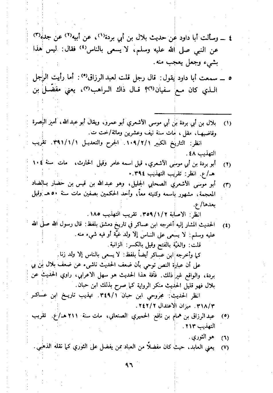 4- وسَأَلتُ أبا دَاوُد عَن حَدِيثِ بِلَالِ بْنِ أَبِي بردة1، عَن أَبِيهِ2 عَنْ جَدِّهِ3 عَنِ النَّبِيِّ صَلَّى اللَّهُ عَلَيْهِ وَسَلَّمَ، "لا يَسْعَى بِالنَّاسِ" 4 فَقَالَ: لَيْسَ هَذَا بشيء وجعل يَعْجَب منه.