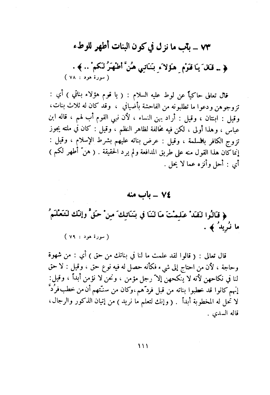 قَالَ تَعَالَى حاكيا عَن لوط عَلَيْهِ السَّلَام {يَا قوم هَؤُلَاءِ بَنَاتِي} أَي تزوجوهن ودعوا مَا تطلبونه من الْفَاحِشَة بأضيافي وَقد كَانَ لَهُ ثَلَاث بَنَات وَقيل ابنتان وَقيل أَرَادَ بِهن النِّسَاء لِأَن نَبِي الْقَوْم أَب لَهُم قَالَه ابْن عَبَّاس وَهَذَا أولى لَكِن فِيهِ مُخَالفَة لظَاهِر النّظم وَقيل كَانَ فِي مِلَّته يجوز تزوج الْكَافِر بالمسلمة وَقيل عرض بَنَاته عَلَيْهِم بِشَرْط الْإِسْلَام وَقيل إِنَّمَا كَانَ هَذَا القَوْل مِنْهُ على طَرِيق المدافعة وَلم يرد الْحَقِيقِيَّة {هن أطهر لكم} أَي أحل وأنزه عَمَّا لَا يحل 74