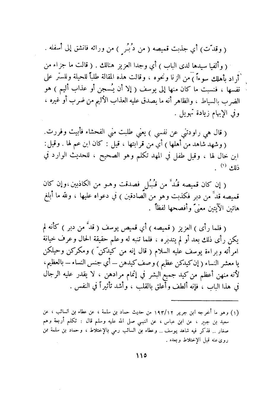 {وقدت} أَي جذبت قَمِيصه {من دبر} من وَرَائه فانشق إِلَى أَسْفَله {وألفيا سَيِّدهَا لَدَى الْبَاب} أَي وجدا الْعَزِيز هُنَالك {قَالَت مَا جَزَاء من أَرَادَ بأهلك سوءا} من الزِّنَا وَنَحْوه وَقَالَت هَذِه الْمقَالة طلبا للحيلة وللستر على نَفسهَا فنسبت مَا كَانَ مِنْهَا إِلَى يُوسُف {إِلَّا أَن يسجن أَو عَذَاب أَلِيم} هُوَ الضَّرْب بالسياط وَالظَّاهِر أَنه مَا يصدق عَلَيْهِ الْعَذَاب الْأَلِيم من ضرب أَو غَيره وَفِي الْإِبْهَام زِيَادَة تهويل {قَالَ هِيَ راودتني عَن نَفسِي} يَعْنِي طلبت مني الْفَحْشَاء فأبيت وفررت {وَشهد شَاهد من أَهلهَا} أَي من قرابتها قيل كَانَ ابْن عَم لَهَا وَقيل ابْن خَال لَهَا وَقيل طِفْل فِي المهد تكلم وَهُوَ الصَّحِيح للْحَدِيث الْوَارِد فِي ذَلِك {إِن كَانَ قَمِيصه قد من قبل فصدقت وَهُوَ من الْكَاذِبين وَإِن كَانَ قَمِيصه قد من دبر فَكَذبت وَهُوَ من الصَّادِقين} فِي دَعْوَاهُ عَلَيْهَا وَللَّه مَا أبلغ هَاتين الْآيَتَيْنِ معنى وأفصحها لفظا {فَلَمَّا رأى} الْعَزِيز {قَمِيصه} أَي قَمِيص يُوسُف {قد من دبر} كَأَنَّهُ لم يكن رأى ذَلِك بعد أَو لم يتدبره فَلَمَّا تنبه لَهُ وَعلم حَقِيقَة الْحَال وَعرف خِيَانَة امْرَأَته وَبَرَاءَة يُوسُف عَلَيْهِ السَّلَام {قَالَ إِنَّه من كيدكن} ومكركن وحيلكن يَا معشر النِّسَاء {إِن كيدكن عَظِيم} وصف كيدهن أَي جنس النِّسَاء بالعظيم لِأَنَّهُ مِنْهُنَّ أعظم من كيد جَمِيع الْبشر فِي إتْمَام مرادهن لَا يقدر عَلَيْهِ الرِّجَال فِي هَذَا الْبَاب فَإِنَّهُ ألطف وأعلق بِالْقَلْبِ وَأَشد تَأْثِيرا فِي النَّفس