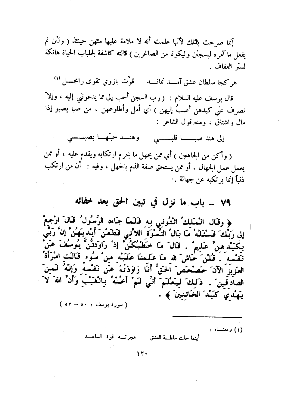 {وَقَالَ الْملك ائْتُونِي بِهِ فَلَمَّا جَاءَهُ الرَّسُول قَالَ ارْجع إِلَى رَبك فَاسْأَلْهُ مَا بَال النسْوَة اللَّاتِي قطعن أَيْدِيهنَّ إِن رَبِّي بكيدهن عليم قَالَ مَا خطبكن إِذْ راودتن يُوسُف عَن نَفسه قُلْنَ حاش لله مَا علمنَا عَلَيْهِ من سوء قَالَت امْرَأَة الْعَزِيز الْآن حصحص الْحق أَنا راودته عَن نَفسه وَإنَّهُ لمن الصَّادِقين ذَلِك ليعلم أَنِّي لم أخنه بِالْغَيْبِ وَأَن الله لَا يهدي كيد الخائنين}