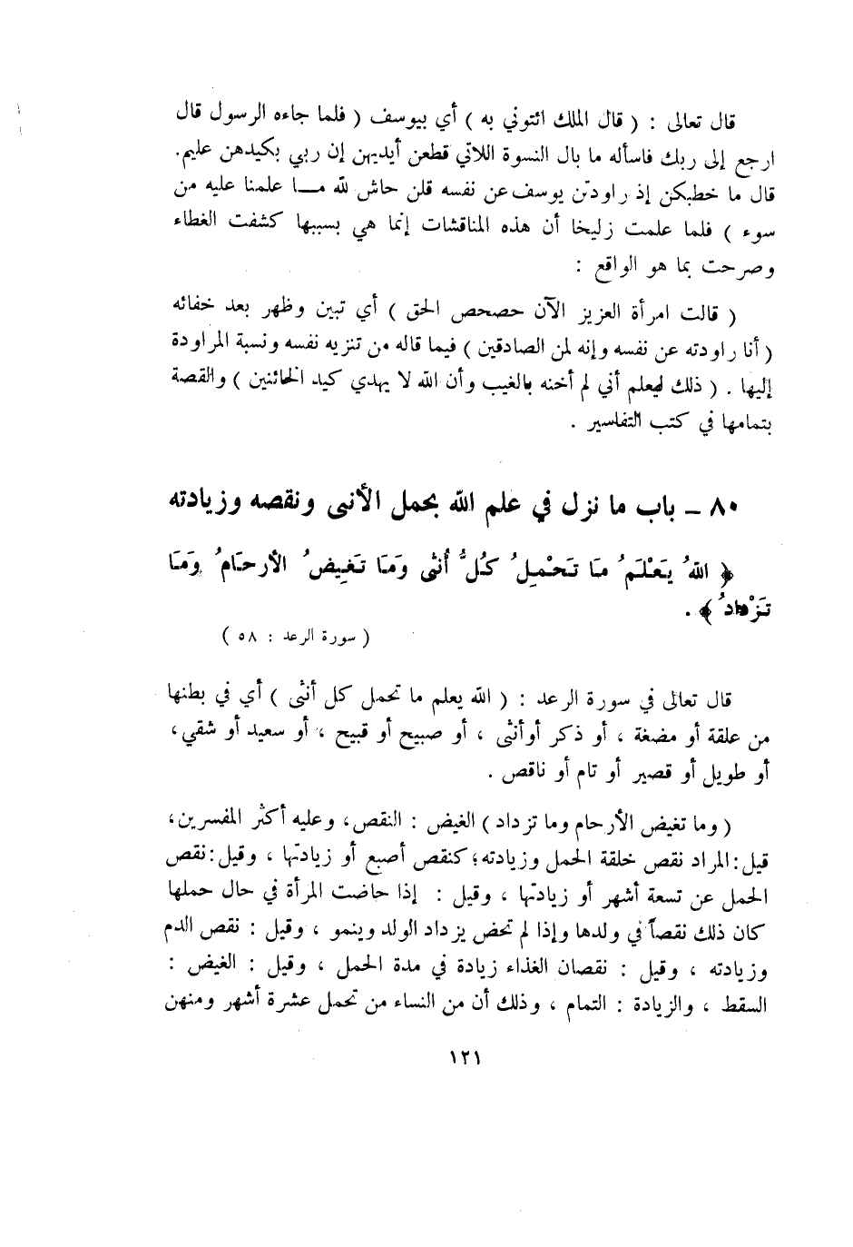 قَالَ تَعَالَى فِي سُورَة الرَّعْد {الله يعلم مَا تحمل كل أُنْثَى} أَي فِي بَطنهَا من علقَة أَو مُضْغَة أَو ذكر أَو أُنْثَى أَو صبيح أَو قَبِيح أَو سعيد أَو شقي أَو طَوِيل أَو قصير أَو تَامّ أَو نَاقص {وَمَا تغيض الْأَرْحَام وَمَا تزداد} الغيض النَّقْص وَعَلِيهِ أَكثر الْمُفَسّرين قيل المُرَاد نقص خلقَة الْحمل وزيادته كنقص أصْبع أَو زيادتها وَقيل نقص الْحمل عَن تِسْعَة أشهر أَو زيادتها وَقيل إِذا حَاضَت الْمَرْأَة فِي حَال حملهَا كَانَ ذَلِك نقصا فِي وَلَدهَا وَإِذا لم تَحض يزْدَاد الْوَلَد وينمو وَقيل نقص الدَّم وزيادته وَقيل نُقْصَان الْغذَاء زِيَادَة فِي مُدَّة الْحمل وَقيل الغيض السقط وَالزِّيَادَة التَّمام وَذَلِكَ أَن من النِّسَاء من تحمل عشرَة أشهر ومنهن