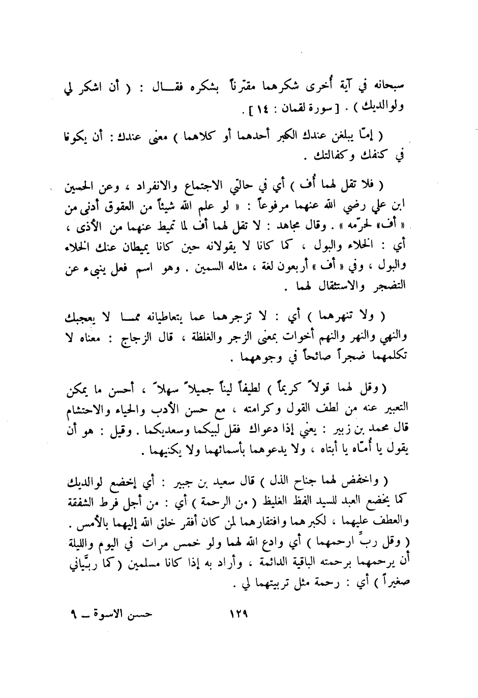 سُبْحَانَهُ فِي آيَة أُخْرَى شكرهما مقترنا بشكره فَقَالَ {أَن اشكر لي ولوالديك} سُورَة لُقْمَان {إِمَّا يبلغن عنْدك الْكبر أَحدهمَا أَو كِلَاهُمَا} معنى عنْدك أَن يَكُونَا فِي كنفك وكفالتك {فَلَا تقل لَهما أُفٍّ} أَي فِي حالتي الِاجْتِمَاع والانفراد وَعَن الْحُسَيْن ابْن عَليّ رَضِي الله عَنْهُمَا مَرْفُوعا لَو علم الله شَيْئا من العقوق أدنى من أُفٍّ لحرمه وَقَالَ مُجَاهِد لَا تقل لَهما أُفٍّ لما تميط عَنْهُمَا من الْأَذَى أَي الْخَلَاء وَالْبَوْل كَمَا كَانَا لَا يقولانه حِين كَانَا يميطان عَنْك الْخَلَاء وَالْبَوْل وَفِي أُفٍّ أَرْبَعُونَ لُغَة مِثَاله السمين وَهُوَ اسْم فعل يُنبئ عَن التضجر والاستثقال لَهما {وَلَا تنهرهما} أَي لَا تزجرهما عَمَّا يتعاطيانه مِمَّا لَا يُعْجِبك وَالنَّهْي وَالنّهر والنهم أَخَوَات بِمَعْنى الزّجر والغلظة قَالَ الزّجاج مَعْنَاهُ لَا تكلمهما ضجرا صائحا فِي وُجُوههمَا {وَقل لَهما قولا كَرِيمًا} لطيفا لينًا جميلا سهلا أحسن مَا يُمكن التَّعْبِير عَنهُ من لطف القَوْل وكرامته مَعَ حسن الْأَدَب وَالْحيَاء والاحتشام قَالَ مُحَمَّد بن زبير يَعْنِي إِذا دعواك فَقل لبيكما وسعديكما وَقيل هُوَ أَن يَقُول يَا أُمَّاهُ يَا أبتاه وَلَا يدعوهما بأسمائهما وَلَا يكنيهما {واخفض لَهما جنَاح الذل} قَالَ سعيد بن جُبَير أَي إخضع لوالديك كَمَا يخضع العَبْد للسَّيِّد الْفظ الغيلظ {من الرَّحْمَة} أَي من أجل فرط الشَّفَقَة والعطف عَلَيْهِمَا لكبرهما وافتقارهما لمن كَانَ أفقر خلق الله إِلَيْهِمَا بالْأَمْس {وَقل رب ارحمهما} أَي وادع الله لَهما وَلَو خمس مَرَّات فِي الْيَوْم وَاللَّيْلَة أَن يرحمهما برحمته الْبَاقِيَة الدائمة وَأَرَادَ بِهِ إِذا كَانَا مُسلمين {كَمَا ربياني صَغِيرا} أَي رَحْمَة مثل تربيتهما لي