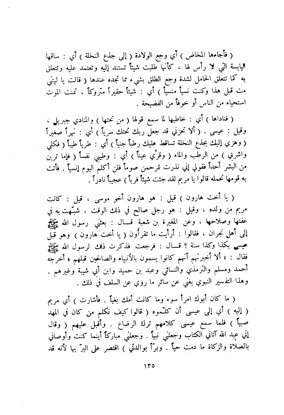 {فأجاءها الْمَخَاض} أَي وجع الْولادَة {إِلَى جذع النَّخْلَة} أَي سَاقهَا الْيَابِسَة الَّتِي لَا رَأس لَهَا كَأَنَّهَا طلبت شَيْئا تستند إِلَيْهِ وتعتمد عَلَيْهِ وتتعلق بِهِ كَمَا تتَعَلَّق الْحَامِل لشدَّة وجع الطلق بِشَيْء مِمَّا تَجدهُ عِنْدهَا {قَالَت يَا لَيْتَني مت قبل هَذَا وَكنت نسيا منسيا} أَي شَيْئا حَقِيرًا متروكا تمنت الْمَوْت استحياء من النَّاس أَو خوفًا من الفضيحة {فناداها} أَي خاطبها لما سمع قَوْلهَا {من تحتهَا} والمنادي جِبْرِيل وَقيل عِيسَى {أَلا تحزني قد جعل رَبك تَحْتك سريا} أَي نَهرا صَغِيرا {وهزي إِلَيْك بجذع النَّخْلَة تساقط عَلَيْك رطبا جنيا} أَي طريا طيبا {فكلي واشربي} من الرطب وَالْمَاء {وقري عينا} أَي وطيبي نفسا {فإمَّا تَرين من الْبشر أحدا فَقولِي إِنِّي نذرت للرحمن صوما فَلَنْ أكلم الْيَوْم إنسيا فَأَتَت بِهِ قَومهَا تحمله قَالُوا يَا مَرْيَم لقد جِئْت شَيْئا فريا} عجيبا نَادرا {يَا أُخْت هَارُون} قيل هُوَ هَارُون أَخُو مُوسَى قيل كَانَت مَرْيَم من وَلَده وَقيل هُوَ رجل صَالح فِي ذَلِك الْوَقْت شبهت بِهِ فِي عفتها وصلاحها وَعَن الْمُغيرَة بن شُعْبَة قَالَ بَعَثَنِي رَسُول الله صلى الله عَلَيْهِ وَسلم إِلَى أهل نَجْرَان فَقَالُوا أَرَأَيْت مَا تقرأون {يَا أُخْت هَارُون} وَهُوَ قبل عِيسَى بِكَذَا وَكَذَا سنة قَالَ فَرَجَعت فَذكرت ذَلِك لرَسُول الله صلى الله عَلَيْهِ وَسلم فَقَالَ أَلا أَخْبَرتهم أَنهم كَانُوا يسمون بالأنبياء وَالصَّالِحِينَ قبلهم أخرجه أَحْمد وَمُسلم وَالتِّرْمِذِيّ وَالنَّسَائِيّ وَعبد بن حميد وَابْن أبي شيبَة وَغَيرهم وَهَذَا التَّفْسِير النَّبَوِيّ يُغني عَن سَائِر مَا روى عَن السّلف فِي ذَلِك {مَا كَانَ أَبوك امْرأ سوء وَمَا كَانَت أمك بغيا فَأَشَارَتْ} أَي مَرْيَم {إِلَيْهِ} أَي إِلَى عِيسَى أَن كَلمُوهُ {قَالُوا كَيفَ نُكَلِّم من كَانَ فِي المهد صَبيا} فَلَمَّا سمع عِيسَى كَلَامهم ترك الرَّضَاع وَأَقْبل عَلَيْهِم {قَالَ إِنِّي عبد الله آتَانِي الْكتاب وَجَعَلَنِي نَبيا وَجَعَلَنِي مُبَارَكًا أَيْن مَا كنت وأوصاني بِالصَّلَاةِ وَالزَّكَاة مَا دمت حَيا وَبرا بوالدتي} اقْتصر على الْبر بهَا لِأَنَّهُ قد