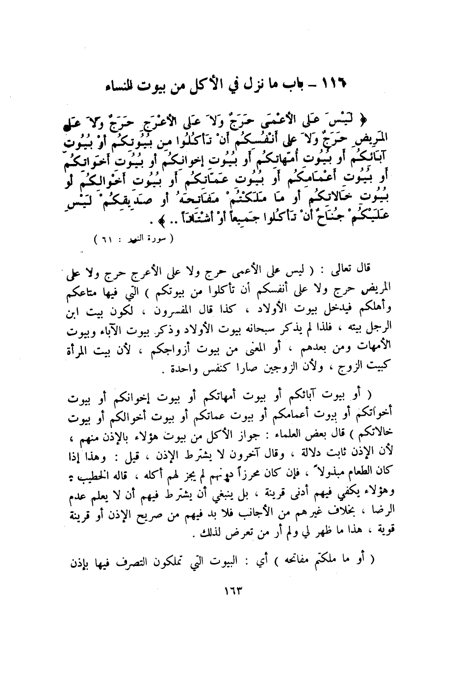 قَالَ تَعَالَى {لَيْسَ على الْأَعْمَى حرج وَلَا على الْأَعْرَج حرج وَلَا على الْمَرِيض حرج وَلَا على أَنفسكُم أَن تَأْكُلُوا من بُيُوتكُمْ} الَّتِي فِيهَا مَتَاعكُمْ وأهلكم فَيدْخل بيُوت الْأَوْلَاد كَذَا قَالَ الْمُفَسِّرُونَ لكَون بَيت ابْن الرجل بَيته فَلِذَا لم يذكر سُبْحَانَهُ بيُوت الْأَوْلَاد وَذكر بيُوت الْآبَاء وبيوت الْأُمَّهَات وَمن بعدهمْ أَو الْمَعْنى من بيُوت أزواجكم لِأَن بَيت الْمَرْأَة كبيت الزَّوْج وَلِأَن الزَّوْجَيْنِ صَارا كَنَفس وَاحِدَة {أَو بيُوت آبائكم أَو بيُوت أُمَّهَاتكُم أَو بيُوت إخْوَانكُمْ أَو بيُوت أخواتكم أَو بيُوت أعمامكم أَو بيُوت عماتكم أَو بيُوت أخوالكم أَو بيُوت خالاتكم} قَالَ بعض الْعلمَاء جَوَاز الْأكل من بيُوت هَؤُلَاءِ بِالْإِذْنِ مِنْهُم لِأَن الْإِذْن ثَابت دلَالَة وَقَالَ آخَرُونَ لَا يشْتَرط الْإِذْن قيل وَهَذَا إِذا كَانَ الطَّعَام مبذولا فَإِن كَانَ محرزا دونهم لم يجز لَهُم أكله قَالَه الْخَطِيب وَهَؤُلَاء يَكْفِي فيهم أدنى قرينَة بل يَنْبَغِي أَن يشْتَرط فيهم أَن لَا يعلم عدم الرِّضَا بِخِلَاف غَيرهم من الْأَجَانِب فَلَا بُد فيهم من صَرِيح الْإِذْن أَو قرينَة قَوِيَّة هَذَا مَا ظهر لي وَلم أر من تعرض لذَلِك {أَو مَا ملكتم مفاتحه} أَي الْبيُوت الَّتِي تَمْلِكُونَ التَّصَرُّف فِيهَا بِإِذن