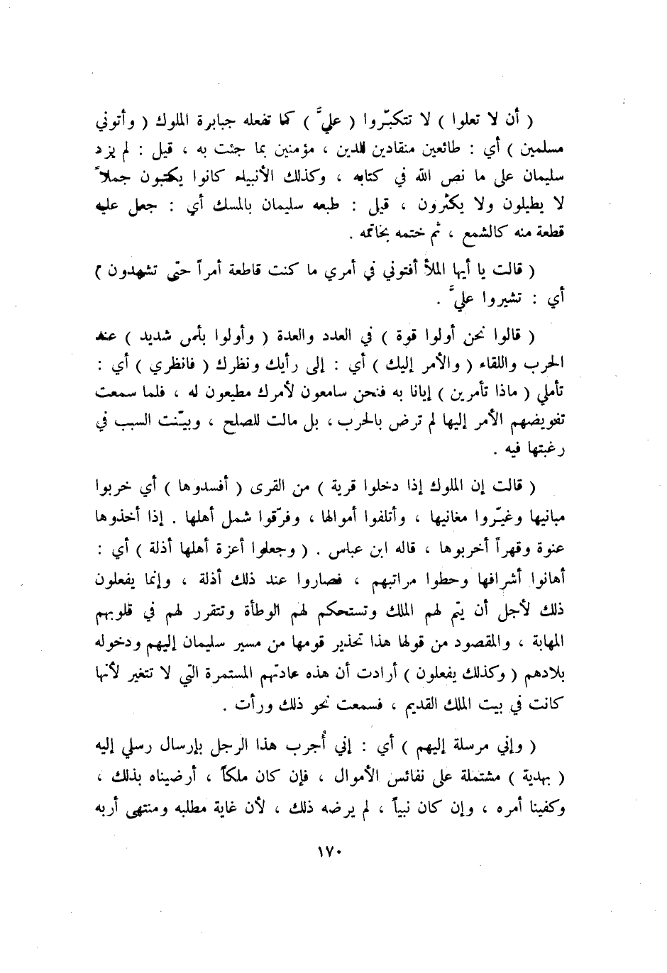 {أَلا تعلوا} لَا تتكبروا {على} كَمَا تَفْعَلهُ جبابرة الْمُلُوك {وأتوني مُسلمين} أَي طائعين منقادين للدّين مُؤمنين بِمَا جِئْت بِهِ قيل لم يزدْ سُلَيْمَان على مَا نَص الله فِي كِتَابه وَكَذَلِكَ الْأَنْبِيَاء كَانُوا يَكْتُبُونَ جملا لَا يطيلون وَلَا يكثرون قيل طبعه سُلَيْمَان بالمسك أَي جعل عَلَيْهِ قِطْعَة مِنْهُ كالشمع ثمَّ خَتمه بِخَاتمِهِ {قَالَت يَا أَيهَا الْمَلأ أفتوني فِي أَمْرِي مَا كنت قَاطِعَة أمرا حَتَّى تَشْهَدُون} أَي تشيروا عَليّ {قَالُوا نَحن أولُوا قُوَّة} فِي الْعدَد وَالْعدة {وأولو بَأْس شَدِيد} عِنْد الْحَرْب واللقاء {وَالْأَمر إِلَيْك} أَي إِلَى رَأْيك ونظرك {فانظري} أَي تأملي {مَاذَا تأمرين} إيانا بِهِ فَنحْن سامعون لأمرك مطيعون لَهُ فَلَمَّا سَمِعت تفويضهم الْأَمر إِلَيْهَا لم ترض بِالْحَرْبِ بل مَالَتْ للصلح وبينت السَّبَب فِي رغبتها فِيهِ {قَالَت إِن الْمُلُوك إِذا دخلُوا قَرْيَة} من الْقرى {أفسدوها} أَي خربوا مبانيها وغيروا مغانيها وأتلفوا أموالها وَفرقُوا شَمل أَهلهَا إِذا أخذوها عنْوَة وقهرا أخربوها قَالَه ابْن عَبَّاس {وَجعلُوا أعزة أَهلهَا أَذِلَّة} أَي أهانوا أَشْرَافهَا وحطوا مَرَاتِبهمْ فصاروا عِنْد ذَلِك أَذِلَّة وَإِنَّمَا يَفْعَلُونَ ذَلِك لأجل ان يتم لَهُم الْملك وتستحكم لَهُم الْوَطْأَة وتتقرر لَهُم فِي قُلُوبهم المهابة وَالْمَقْصُود من قَوْلهَا هَذَا تحذير قَومهَا من مسير سُلَيْمَان إِلَيْهِم ودخوله بِلَادهمْ {وَكَذَلِكَ يَفْعَلُونَ} أَرَادَت أَن هَذِه عَادَتهم المستمرة الَّتِي لَا تَتَغَيَّر لِأَنَّهَا كَانَت فِي بَيت الْملك الْقَدِيم فَسمِعت نَحْو ذَلِك وَرَأَتْ {وَإِنِّي مُرْسلَة إِلَيْهِم} أَي إِنِّي أجرب هَذَا الرجل بإرسال رُسُلِي إِلَيْهِ {بهدية} مُشْتَمِلَة على نفائس الْأَمْوَال فَإِن كَانَ ملكا أرضيناه بذلك وكفينا أمره وَإِن كَانَ نَبيا لم يرضه ذَلِك لِأَن غَايَة مطلبه ومنتهى أربه