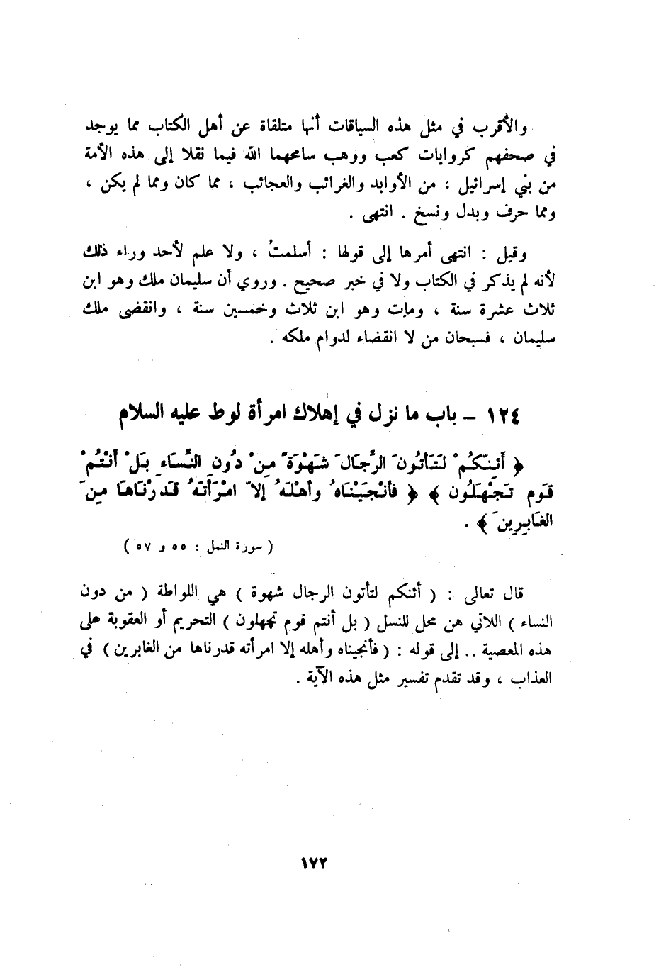 قَالَ تَعَالَى {أئنكم لتأتون الرِّجَال شَهْوَة} هِيَ اللواطة {من دون النِّسَاء} اللَّاتِي هن مَحل للنسل {بل أَنْتُم قوم تجهلون} التَّحْرِيم أَو الْعقُوبَة على هَذِه الْمعْصِيَة إِلَى قَوْله {فأنجيناه وَأَهله إِلَّا امْرَأَته قدرناها من الغابرين} فِي الْعَذَاب وَقد تقدم تَفْسِير مثل هَذِه الْآيَة