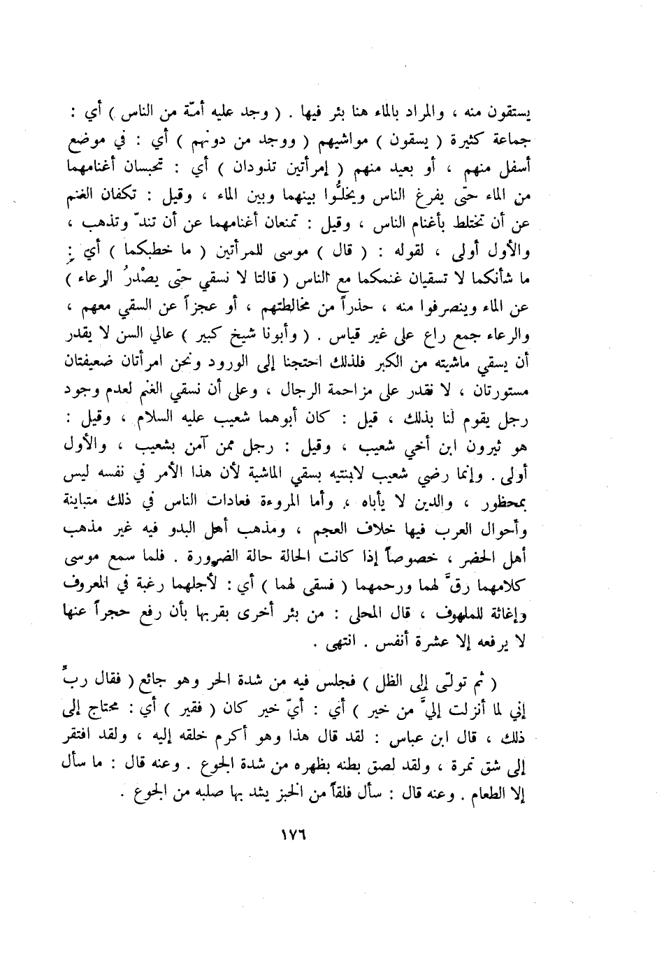 يستقون مِنْهُ وَالْمرَاد بِالْمَاءِ هُنَا بِئْر فِيهَا {وجد عَلَيْهِ أمة من النَّاس} أَي جمَاعَة كَثِيرَة {يسقون} مَوَاشِيهمْ {وَوجد من دونهم} أَي فِي مَوضِع أَسْفَل مِنْهُم أَو بعيد مِنْهُم {امْرَأتَيْنِ تذودان} أَي تحبسان أغنامهما من المَاء حَتَّى يفرغ النَّاس ويخلوا بَينهمَا وَبَين المَاء وَقيل تكفان الْغنم عَن أَن تختلط بأغنام النَّاس وَقيل تمنعان أغنامهما عَن أَن تند وَتذهب وَالْأول أولى لقَوْله {قَالَ} مُوسَى للمرأتين {مَا خطبكما} أَي مَا شأنكما لَا تسقيان غنمكما مَعَ النَّاس {قَالَتَا لَا نسقي حَتَّى يصدر الرعاء} عَن المَاء وينصرفوا مِنْهُ حذرا من مخالطتهم أَو عَجزا عَن السَّقْي مَعَهم والرعاء جمع رَاع على غير قِيَاس {وأبونا شيخ كَبِير} عالي السن لَا يقدر أَن يسْقِي مَاشِيَته من الْكبر فَلذَلِك احتجنا إِلَى الْوُرُود وَنحن امْرَأَتَانِ ضعيفتان مستورتان لَا نقدر على مزاحمة الرِّجَال وعَلى أَن نسقي الْغنم لعدم وجود رجل يقوم لنا بذلك قيل كَانَ أَبوهُمَا شُعَيْب عَلَيْهِ السَّلَام وَقيل هُوَ ثيرون ابْن أخي شُعَيْب وَقيل رجل مِمَّن آمن بشعيب وَالْأول أولى وَإِنَّمَا رَضِي شُعَيْب لابنتيه بسقي الْمَاشِيَة لِأَن هَذَا الْأَمر فِي نَفسه لَيْسَ بمحظور وَالدّين لَا يأباه وَأما الْمُرُوءَة فعادات النَّاس فِي ذَلِك متباينة وأحوال الْعَرَب فِيهَا خلاف الْعَجم وَمذهب أهل البدو فِيهِ غير مَذْهَب أهل الْحَضَر خُصُوصا إِذا كَانَت الْحَالة حَالَة الضَّرُورَة فَلَمَّا سمع مُوسَى كَلَامهمَا رق لَهما ورحمهما {فسقى لَهما} أَي لأجلهما رَغْبَة فِي الْمَعْرُوف وإغاثة للملهوف قَالَ الْمحلى من بِئْر أُخْرَى بقربها بِأَن رفع حجرا عَنْهَا لَا يرفعهُ إِلَّا عشرَة أنفس انْتهى {ثمَّ تولى إِلَى الظل} فَجَلَسَ فِيهِ من شدَّة الْحر وَهُوَ جَائِع {فَقَالَ رب إِنِّي لما أنزلت إِلَيّ من خير} أَي أَي خير كَانَ {فَقير} أَي مُحْتَاج إِلَى ذَلِك قَالَ ابْن عَبَّاس لقد قَالَ هَذَا وَهُوَ أكْرم خلقه إِلَيْهِ وَلَقَد افْتقر إِلَى شقّ تَمْرَة وَلَقَد لصق بَطْنه بظهره من شدَّة الْجُوع وَعنهُ قَالَ مَا سَأَلَ إِلَّا الطَّعَام وَعنهُ قَالَ سَأَلَ فلقا من الْخبز يشد بهَا صلبه من الْجُوع