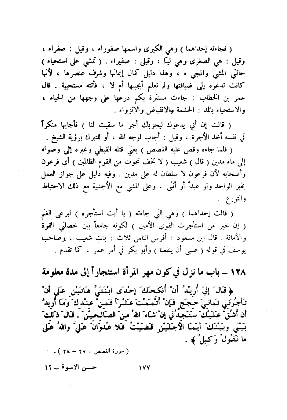 {فَجَاءَتْهُ إِحْدَاهمَا} وَهِي الْكُبْرَى وَاسْمهَا صفوراء وَقيل صفراء وَقيل هِيَ الصُّغْرَى وَهِي ليا وقيلى صفيراء {تمشي على استحياء} حالتي الْمَشْي والمجيء وَهَذَا دَلِيل كَمَال إيمَانهَا وَشرف عنصرها لِأَنَّهَا كَانَت تَدعُوهُ إِلَى ضيافتها وَلم تعلم أيجيبها أم لَا فَأَتَتْهُ مستحيية قَالَ عمر بن الْخطاب جَاءَت مستترة بكم درعها على وَجههَا من الْحيَاء والاستحياء بِالْمدِّ الحشمة والانقباض الانزواء {قَالَت إِن أبي يَدْعُوك ليجزيك أجر مَا سقيت لنا} فأجابها مُنْكرا فِي نَفسه أَخذ الْأُجْرَة وَقيل أجَاب لوجه الله أَو للتبرك بِرُؤْيَة الشَّيْخ {فَلَمَّا جَاءَهُ وقص عَلَيْهِ الْقَصَص} يَعْنِي قَتله القبطي وَغَيره إِلَى وُصُوله إِلَى مَاء مَدين {قَالَ} شُعَيْب {لَا تخف نجوت من الْقَوْم الظَّالِمين} أَي فِرْعَوْن وَأَصْحَابه لِأَن فِرْعَوْن لَا سُلْطَان لَهُ على مَدين وَفِيه دَلِيل على جَوَاز الْعَمَل بِخَبَر الْوَاحِد وَلَو عبدا أَو أُنْثَى وعَلى الْمَشْي مَعَ الْأَجْنَبِيَّة مَعَ ذَلِك الِاحْتِيَاط والتورع {قَالَت إِحْدَاهمَا} وَهِي الَّتِي جَاءَتْهُ {يَا أَبَت اسْتَأْجرهُ} ليرعى الْغنم {إِن خير من اسْتَأْجَرت الْقوي الْأمين} لكَونه جَامعا بَين خصلتي الْقُوَّة وَالْأَمَانَة قَالَ ابْن مَسْعُود أَفرس النَّاس ثَلَاث بنت شُعَيْب وَصَاحب يُوسُف فِي قَوْله عَسى أَن ينفعنا وَأَبُو بكر فِي أَمر عمر كَمَا تقدم