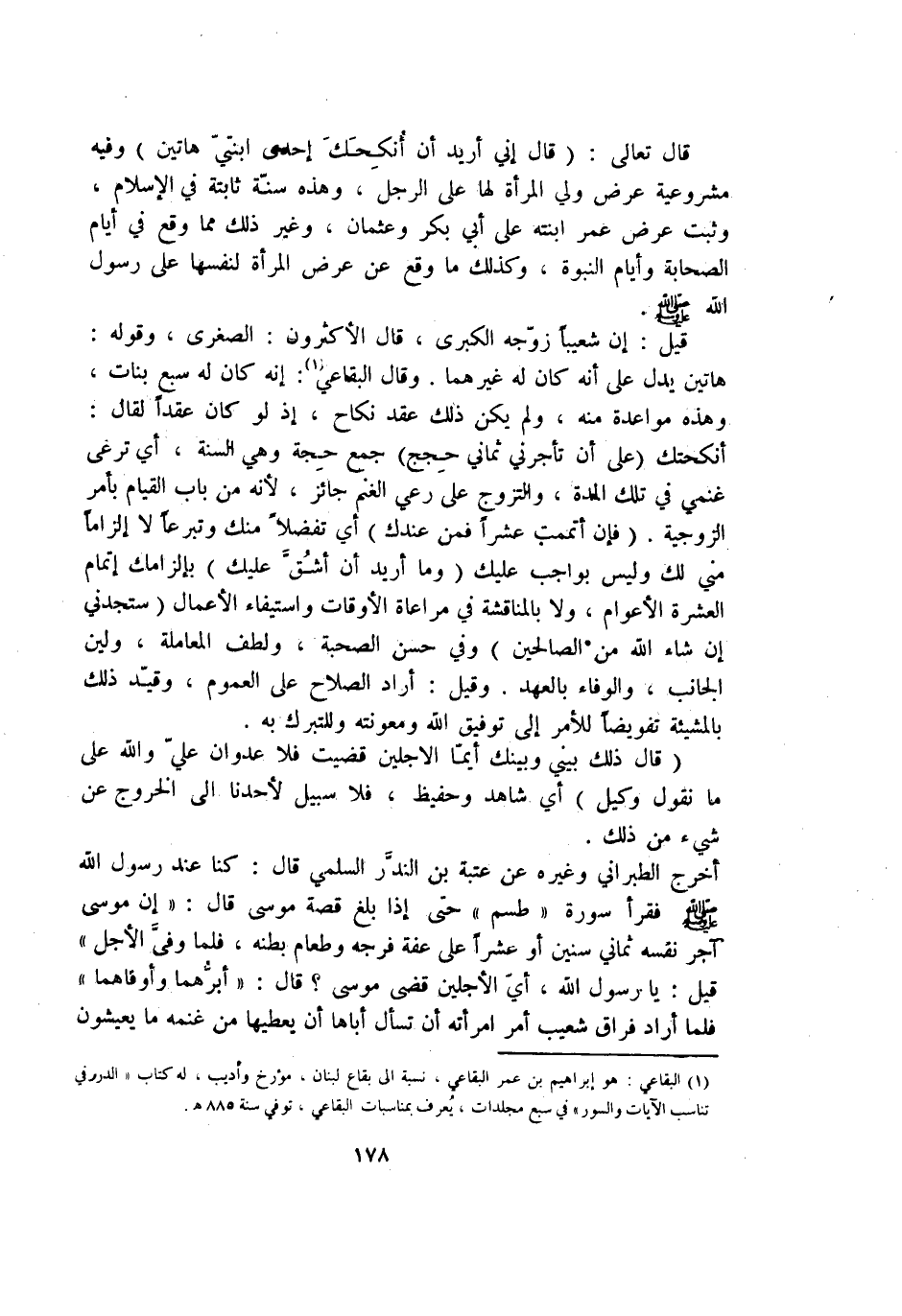 قيل إِن شعيبا زوجه الْكُبْرَى قَالَ الْأَكْثَرُونَ الصُّغْرَى وَقَوله هَاتين يدل على أَنه كَانَ لَهُ غَيرهمَا وَقَالَ البقاعي إِنَّه كَانَ لَهُ سبع بَنَات وَهَذِه مواعدة مِنْهُ وَلم يكن ذَلِك عقد نِكَاح إِذْ لَو كَانَ عقدا لقَالَ أنكحتك {على أَن تَأْجُرنِي ثَمَانِي حجج} جمع حجَّة وَهِي السّنة أَي ترعى غنمي فِي تِلْكَ الْمدَّة والتزوج على رعي الْغنم جَائِز لِأَنَّهُ من بَاب الْقيام بِأَمْر الزَّوْجِيَّة (فَإِن أتممت عشرا فَمن عنْدك) أَي تفضلا مِنْك وتبرعا لَا إلزاما مني لَك وَلَيْسَ بِوَاجِب عَلَيْك {وَمَا أُرِيد أَن أشق عَلَيْك} بإلزامك إتْمَام الْعشْرَة الأعوام وَلَا بالمناقشة فِي مُرَاعَاة الْأَوْقَات وَاسْتِيفَاء الْأَعْمَال {ستجدني إِن شَاءَ الله من الصَّالِحين} وَفِي حسن الصُّحْبَة ولطف الْمُعَامَلَة ولين الْجَانِب وَالْوَفَاء بالعهد وَقيل أَرَادَ الصّلاح على الْعُمُوم وَقيد ذَلِك بِالْمَشِيئَةِ تفويضا لِلْأَمْرِ إِلَى توفيق الله ومعونته وللتبرك بِهِ {قَالَ ذَلِك بيني وَبَيْنك أَيّمَا الْأَجَليْنِ قضيت فَلَا عدوان عَليّ وَالله على مَا نقُول وَكيل} أَي شَاهد وحفيظ فَلَا سَبِيل لِأَحَدِنَا إِلَى الْخُرُوج عَن شَيْء من ذَلِك