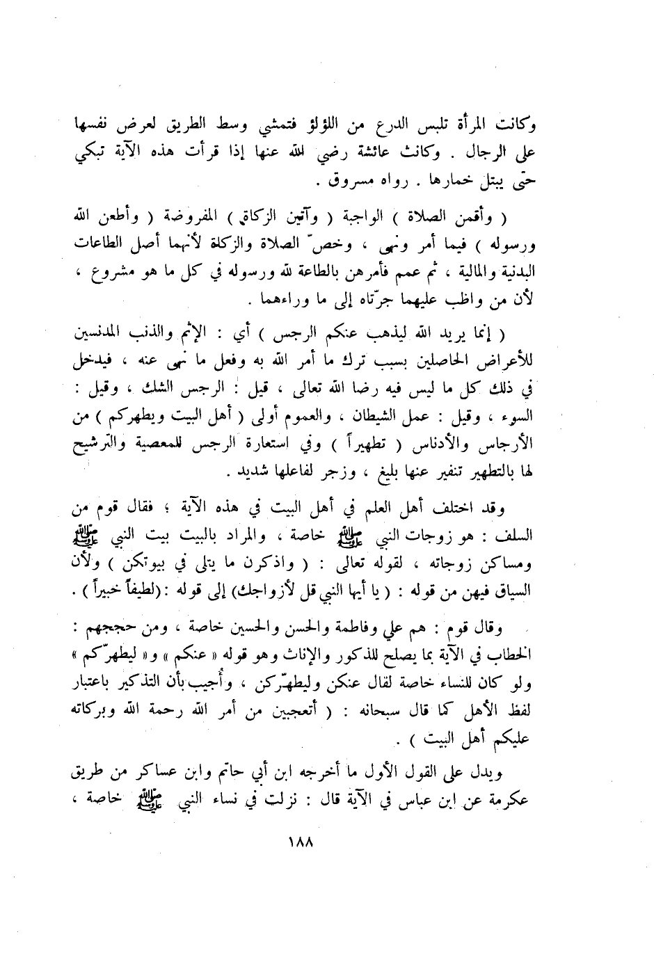 وَقد اخْتلف أهل الْعلم فِي أهل الْبَيْت فِي هَذِه الْآيَة فَقَالَ قوم من السّلف هُوَ زَوْجَات النَّبِي صلى الله عَلَيْهِ وَسلم خَاصَّة وَالْمرَاد بِالْبَيْتِ بَيت النَّبِي صلى الله عَلَيْهِ وَسلم ومساكن زَوْجَاته لقَوْله تَعَالَى {واذكرن مَا يُتْلَى فِي بيوتكن} وَلِأَن السِّيَاق فِيهِنَّ من قَوْله {يَا أَيهَا النَّبِي قل لِأَزْوَاجِك} إِلَى قَوْله {لطيفا خَبِيرا}