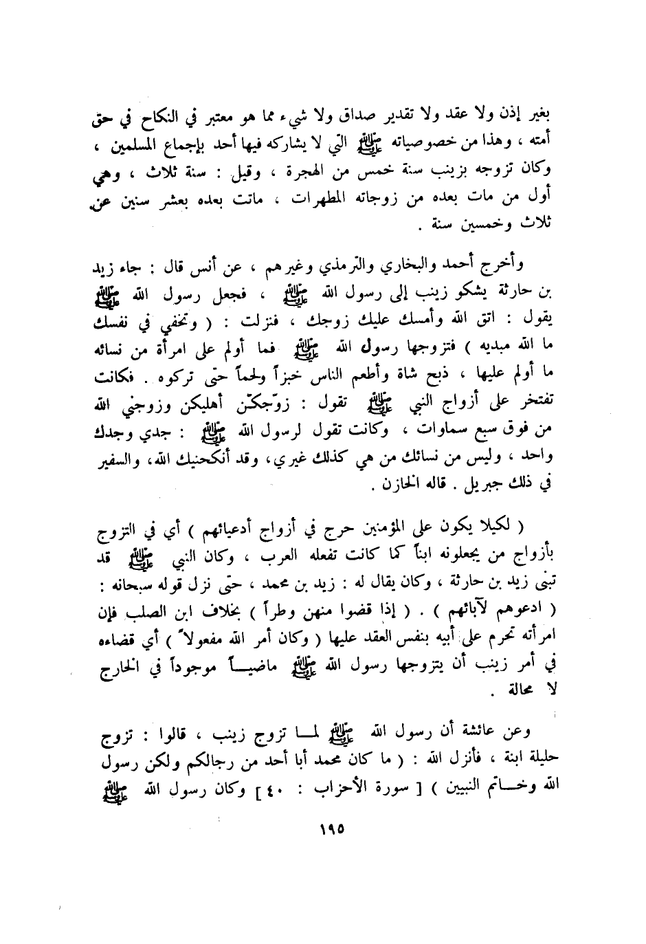 وَعَن عَائِشَة أَن رَسُول الله صلى الله عَلَيْهِ وَسلم لما تزوج زَيْنَب قَالُوا تزوج حَلِيلَة ابْنه فَأنْزل الله {مَا كَانَ مُحَمَّد أَبَا أحد من رجالكم وَلَكِن رَسُول الله وَخَاتم النَّبِيين} وَكَانَ رَسُول الله صلى الله عَلَيْهِ وَسلم