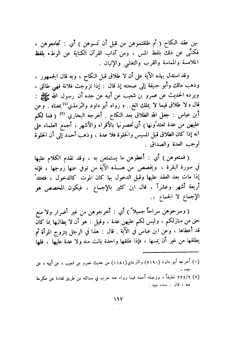 وَقد اسْتدلَّ بِهَذِهِ الْآيَة على أَن لَا طَلَاق قبل النِّكَاح وَبِه قَالَ الْجُمْهُور وَذهب مَالك وَأَبُو حنيفَة إِلَى صِحَّته إِذْ قَالَ إِذا تزوجت فُلَانَة فَهِيَ طَالِق وَيَردهُ الحَدِيث عَن عَمْرو بن شُعَيْب عَن أَبِيه عَن جده أَن رَسُول الله صلى الله عَلَيْهِ وَسلم قَالَ لَا طَلَاق فِيمَا لَا يملك الخ رَوَاهُ أَبُو دَاوُد وَالتِّرْمِذِيّ بِمَعْنَاهُ وَعَن أبن عَبَّاس جعل الله الطَّلَاق بعد النِّكَاح أخرجه البُخَارِيّ {فَمَا لكم عَلَيْهِنَّ من عدَّة تعتدونها} أَي تحصونها بِالْأَقْرَاءِ وَالْأَشْهر أجمع الْعلمَاء على أَنه إِذا كَانَ الطَّلَاق قبل الْمَسِيس وَالْخلْوَة فَلَا عدَّة وَذهب أَحْمد إِلَى أَن الْخلْوَة توجب الْعدة وَالصَّدَاق {فمتعوهن} أَي أعطوهن مَا يستمتعن بِهِ وَقد تقدم الْكَلَام عَلَيْهَا فِي سُورَة الْبَقَرَة ويخصص من هَذِه الْآيَة من توفّي عَنْهَا زَوجهَا فَإِنَّهُ إِذا مَاتَ بعد العقد عَلَيْهَا وَقبل الدُّخُول بهَا كَانَ الْمَوْت كالدخول فَتعْتَد أَرْبَعَة أشهر وَعشرا قَالَ ابْن كثير بِالْإِجْمَاع فَيكون الْمُخَصّص هُوَ الْإِجْمَاع لَا الْجِمَاع {وسرحوهن سراحا جميلا} أَي أخرجوهن من غير أضرار وَلَا منع حق من مَنَازِلكُمْ وَلَيْسَ لكم عَلَيْهِنَّ عدَّة وَقيل هُوَ أَن لَا يطالبها بِمَا كَانَ قد أَعْطَاهَا وَعَن ابْن عَبَّاس فِي الْآيَة قَالَ هَذَا فِي الرجل يتَزَوَّج الْمَرْأَة ثمَّ يطلقهَا من غير أَن يَمَسهَا فَإِذا طَلقهَا وَاحِدَة بَانَتْ مِنْهُ وَلَا عدَّة عَلَيْهَا فلهَا