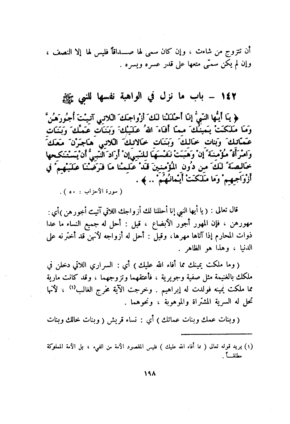 {يَا أَيهَا النَّبِي إِنَّا أَحللنَا لَك أَزوَاجك اللَّاتِي آتيت أُجُورهنَّ وَمَا ملكت يَمِينك مِمَّا أَفَاء الله عَلَيْك وَبَنَات عمك وَبَنَات عَمَّاتك وَبَنَات خَالك وَبَنَات خَالَاتك اللَّاتِي هَاجَرْنَ مَعَك وَامْرَأَة مُؤمنَة إِن وهبت نَفسهَا للنَّبِي إِن أَرَادَ النَّبِي أَن يستنكحها خَالِصَة لَك من دون الْمُؤمنِينَ قد علمنَا مَا فَرضنَا عَلَيْهِم فِي أَزوَاجهم وَمَا ملكت أَيْمَانهم}