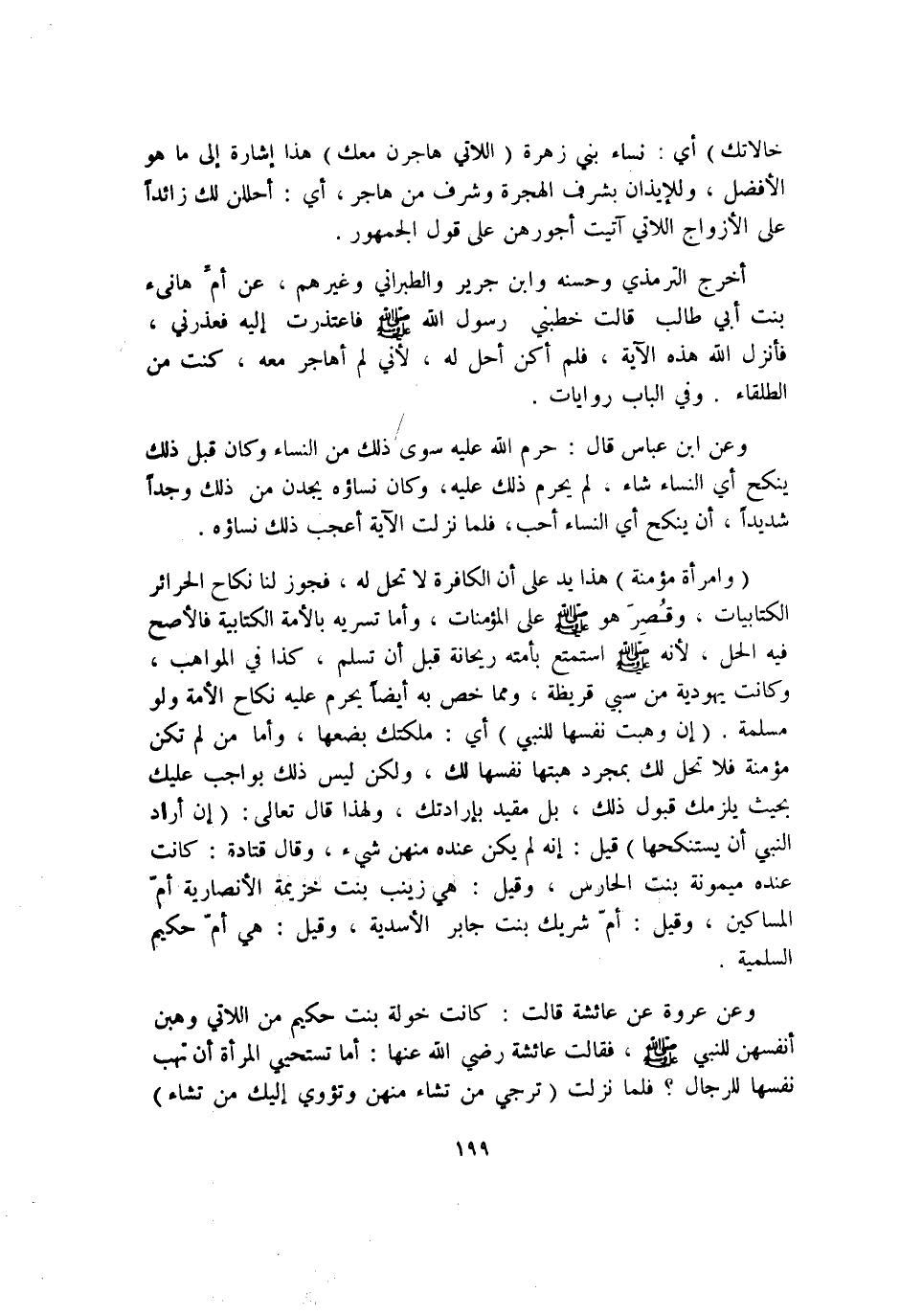 أخرج التِّرْمِذِيّ وَحسنه وَابْن جرير وَالطَّبَرَانِيّ وَغَيرهم عَن أم هَانِيء بنت أبي طَالب قَالَت خطبني رَسُول الله صلى الله عَلَيْهِ وَسلم فاعتذرت إِلَيْهِ فعذرني فَأنْزل الله هَذِه الْآيَة فَلم أكن أحل لَهُ لِأَنِّي لم أُهَاجِر مَعَه كنت من الطُّلَقَاء وَفِي الْبَاب رِوَايَات