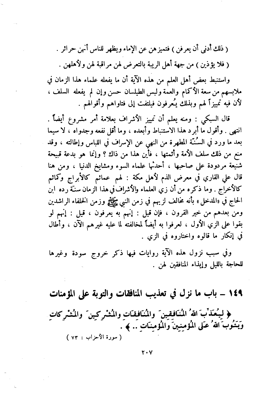 قَالَ السُّبْكِيّ وَمِنْه يعلم أَن تَمْيِيز الْأَشْرَاف بعلامة أَمر مَشْرُوع أَيْضا انْتهى وَأَقُول مَا أبرد هَذَا الاستنباط وأبعده وَمَا أقل نَفعه وجدواه لَا سِيمَا بعد مَا ورد فِي السّنة المطهرة من النَّهْي عَن الْإِسْرَاف فِي اللبَاس وإطالته وَقد منع من ذَلِك سلف الْأمة وأئمتها فَأَيْنَ هَذَا من ذَاك وَإِنَّمَا هُوَ بِدعَة قبيحة شنيعة مَرْدُودَة على صَاحبهَا أحدثها عُلَمَاء السوء ومشايخ الدُّنْيَا وَمن هُنَا قَالَ عَليّ الْقَارِي فِي معرض الذَّم لأهل مَكَّة لَهُم عمائم كالأبراج وكمائم كالأخراج وَمَا ذكره من أَن زِيّ الْعلمَاء والأشراف فِي هَذَا الزَّمَان سنة رده ابْن الْحَاج فِي الْمدْخل بِأَنَّهُ مُخَالف لزيهم فِي زمن النَّبِي صلى الله عَلَيْهِ وَسلم وزمن الْخُلَفَاء الرَّاشِدين وَمن بعدهمْ من خير الْقُرُون فَإِن قيل إِنَّهُم بِهِ يعْرفُونَ قيل إِنَّهُم لَو بقوا على الزي الأول لعرفوا بِهِ أَيْضا لمُخَالفَته لما عَلَيْهِ غَيرهم الْآن وَأطَال فِي إِنْكَار مَا قَالُوهُ واختاروه فِي الزي