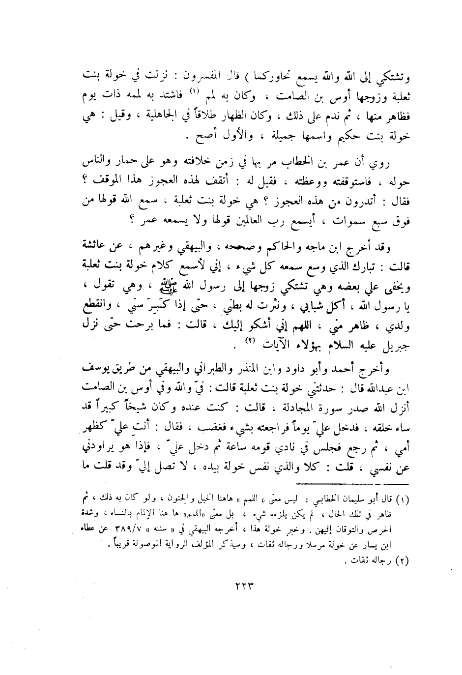 وَقد أخرج ابْن ماجة وَالْحَاكِم وَصَححهُ وَالْبَيْهَقِيّ وَغَيرهم عَن عَائِشَة قَالَت تبَارك الَّذِي وسع سَمعه كل شَيْء إِنِّي لأسْمع كَلَام خَوْلَة بنت ثَعْلَبَة ويخفي عَليّ بعضه وَهِي تَشْتَكِي زَوجهَا إِلَى رَسُول الله صلى الله عَلَيْهِ وَسلم وَهِي تَقول يَا رَسُول الله أكل شَبَابِي وَنَثَرت لَهُ بَطْني حَتَّى إِذا كبر سني وَانْقطع وَلَدي ظَاهر مني اللَّهُمَّ إِنِّي أَشْكُو إِلَيْك قَالَت فَمَا بَرحت حَتَّى نزل جِبْرِيل عَلَيْهِ السَّلَام بهؤلاء الْآيَات