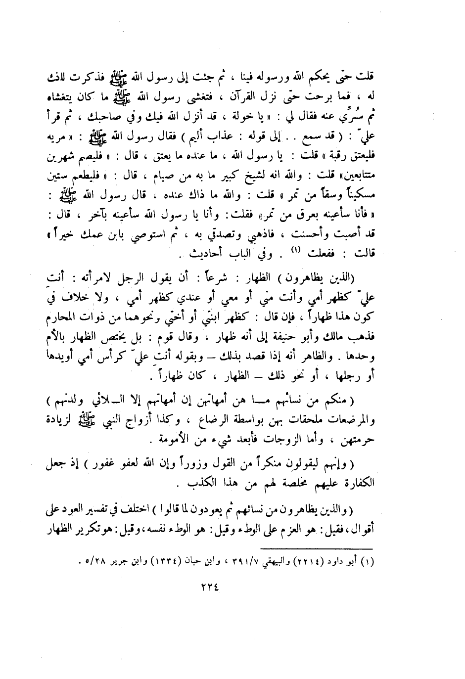 قلت حَتَّى يحكم الله وَرَسُوله فِينَا ثمَّ جِئْت إِلَى رَسُول الله صلى الله عَلَيْهِ وَسلم فَذكرت ذَلِك لَهُ فَمَا بَرحت حَتَّى نزل الْقُرْآن فتغشى رَسُول الله صلى الله عَلَيْهِ وَسلم مَا كَانَ يتغشاه ثمَّ سري عَنهُ فَقَالَ لي يَا خَوْلَة قد أنزل الله فِيك وَفِي صَاحبك ثمَّ قَرَأَ عَليّ {قد سمع} إِلَى قَوْله {عَذَاب أَلِيم} فَقَالَ رَسُول الله صلى الله عَلَيْهِ وَسلم مريه فليعتق رَقَبَة قلت يَا رَسُول الله مَا عِنْده مَا يعْتق قَالَ فليصم شَهْرَيْن مُتَتَابعين قلت وَالله أَنه لشيخ كَبِير مَا بِهِ من صِيَام قَالَ فليطعم سِتِّينَ مِسْكينا وسْقا من تمر قلت وَالله مَا ذَاك عِنْده قَالَ رَسُول الله صلى الله عَلَيْهِ وَسلم فَأَنا سأعينه بعرق من تمر فَقلت وَأَنا يَا رَسُول الله سأعينه بآخر قَالَ قد أصبت وأحسنت فاذهبي وتصدقي بِهِ ثمَّ استوصي بِابْن عمك خيرا قَالَت فَفعلت وَفِي الْبَاب أَحَادِيث {الَّذين يظاهرون} الظِّهَار شرعا أَن يَقُول الرجل لامْرَأَته أَنْت عَليّ كَظهر أُمِّي وَأَنت مني أَو معي أَو عِنْدِي كَظهر أُمِّي وَلَا خلاف فِي كَون هَذَا ظِهَارًا فَإِن قَالَ كَظهر ابْنَتي أَو أُخْتِي وَنَحْوهمَا من ذَوَات الْمَحَارِم فَذهب مَالك وَأَبُو حنيفَة إِلَى أَنه ظِهَار وَقَالَ قوم بل يخْتَص الظِّهَار بِالْأُمِّ وَحدهَا وَالظَّاهِر أَنه إِذا قصد بذلك وَبِقَوْلِهِ أَنْت عَليّ كرأس أُمِّي أَو يَدهَا أَو رجلهَا أَو نَحْو ذَلِك الظِّهَار كَانَ ظِهَارًا {مِنْكُم من نِسَائِهِم مَا هن أمهاتهم إِن أمهاتهم إِلَّا اللائي ولدنهم} والمرضعات ملحقات بِهن بِوَاسِطَة الرَّضَاع وَكَذَا أَزوَاج النَّبِي صلى الله عَلَيْهِ وَسلم لزِيَادَة حرمتهن وَأما الزَّوْجَات فأبعد شَيْء من الأمومة {وَإِنَّهُم ليقولون مُنْكرا من القَوْل وزورا وَإِن الله لعفو غَفُور} إِذْ جعل الْكَفَّارَة عَلَيْهِم مخلصة لَهُم من هَذَا الْكَذِب {وَالَّذين يظاهرون من نِسَائِهِم ثمَّ يعودون لما قَالُوا} اخْتلف فِي تَفْسِير الْعود على أَقْوَال فَقيل هُوَ الْعَزْم على الْوَطْء وَقيل هُوَ الْوَطْء نَفسه وَقيل هُوَ تَكْرِير الظِّهَار