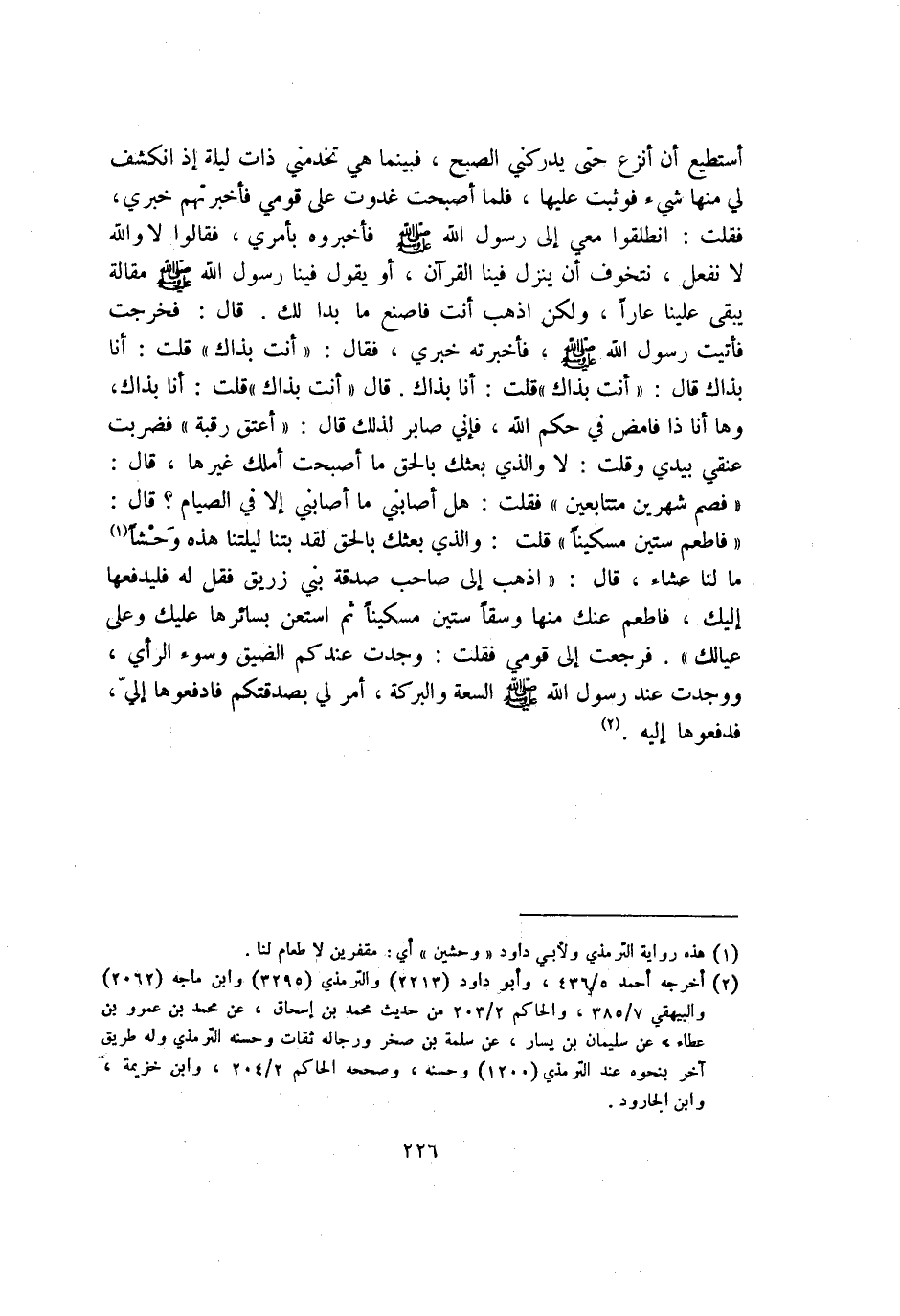 أَسْتَطِيع أَن أنزع حَتَّى يدركني الصُّبْح فَبَيْنَمَا هِيَ تخدمني ذَات لَيْلَة إِذْ انْكَشَفَ لي مِنْهَا شَيْء فَوَثَبت عَلَيْهَا فَلَمَّا أَصبَحت غَدَوْت على قومِي فَأَخْبَرتهمْ خبري فَقلت انْطَلقُوا معي إِلَى رَسُول الله صلى الله عَلَيْهِ وَسلم فأخبروه بأَمْري فَقَالُوا لَا وَالله لَا نَفْعل نتخوف أَن ينزل فِينَا الْقُرْآن أَو يَقُول فِينَا رَسُول الله صلى الله عَلَيْهِ وَسلم مقَالَة يبْقى علينا عارا وَلَكِن اذْهَبْ أَنْت فَاصْنَعْ مَا بدا لَك قَالَ فَخرجت فَأتيت رَسُول الله صلى الله عَلَيْهِ وَسلم فَأَخْبَرته خبري فَقَالَ أَنْت بِذَاكَ قلت أَنا بِذَاكَ قَالَ أَنْت بِذَاكَ قلت أَنا بِذَاكَ قَالَ أَنْت بِذَاكَ قلت أَنا بِذَاكَ وَهَا أَنا ذَا فَامْضِ فِي حكم الله فَإِنِّي صابر لذَلِك قَالَ أعتق رَقَبَة فَضربت عنقِي بيَدي وَقلت لَا وَالَّذِي بَعثك بِالْحَقِّ مَا أَصبَحت أملك غَيرهَا قَالَ فَصم شَهْرَيْن مُتَتَابعين فَقلت هَل أصابني مَا أصابني إِلَّا فِي الصّيام قَالَ فاطعم سِتِّينَ مِسْكينا قلت وَالَّذِي بَعثك بِالْحَقِّ لقد بتنا ليلتنا هَذِه وحشا مَا لنا عشَاء قَالَ اذْهَبْ إِلَى صَاحب صَدَقَة بني زُرَيْق فَقل لَهُ فليدفعها إِلَيْك فاطعم عَنْك مِنْهَا وسْقا سِتِّينَ مِسْكينا ثمَّ اسْتَعِنْ بسائرها عَلَيْك وعَلى عِيَالك فَرَجَعت إِلَى قومِي فَقلت وجدت عنْدكُمْ الضّيق وَسُوء الرَّأْي وَوجدت عِنْد رَسُول الله صلى الله عَلَيْهِ وَسلم السعَة وَالْبركَة أَمر لي بصدقتكم فادفعوها إِلَيّ فدفعوها إِلَيْهِ