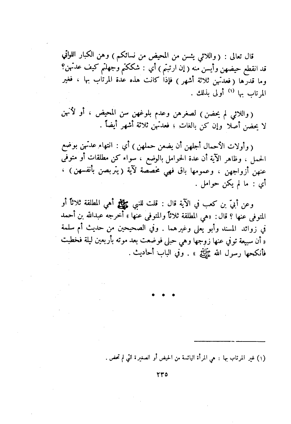 قَالَ تَعَالَى {واللائي يئسن من الْمَحِيض من نِسَائِكُم} وَهن الْكِبَار اللواتي قد انْقَطع حيضهن وأيسن مِنْهُ {إِن ارتبتم} أَي شَكَكْتُمْ وجهلتم كَيفَ عدتهن وَمَا قدرهَا {فعدتهن ثَلَاثَة أشهر} فَإِذا كَانَت هَذِه عدَّة المرتاب بهَا فَغير المرتاب بهَا أولى بذلك {واللائي لم يحضن} لصغرهن وَعدم بلوغهن سنّ الْمَحِيض أَو لِأَنَّهُنَّ لَا يحضن أصلا وَإِن كن بالغات فعدتهن ثَلَاثَة أشهر أَيْضا {وَأولَات الْأَحْمَال أَجلهنَّ أَن يَضعن حَملهنَّ} أَي انْتِهَاء عدتهن بِوَضْع الْحمل وَظَاهر الْآيَة أَن عدَّة الْحَوَامِل بِالْوَضْعِ سَوَاء كن مطلقات أَو متوفي عَنْهُن أَزوَاجهنَّ وعمومها بَاقٍ فَهِيَ مخصصة لآيَة {يَتَرَبَّصْنَ بِأَنْفُسِهِنَّ} أَي مَا لم يكن حوامل