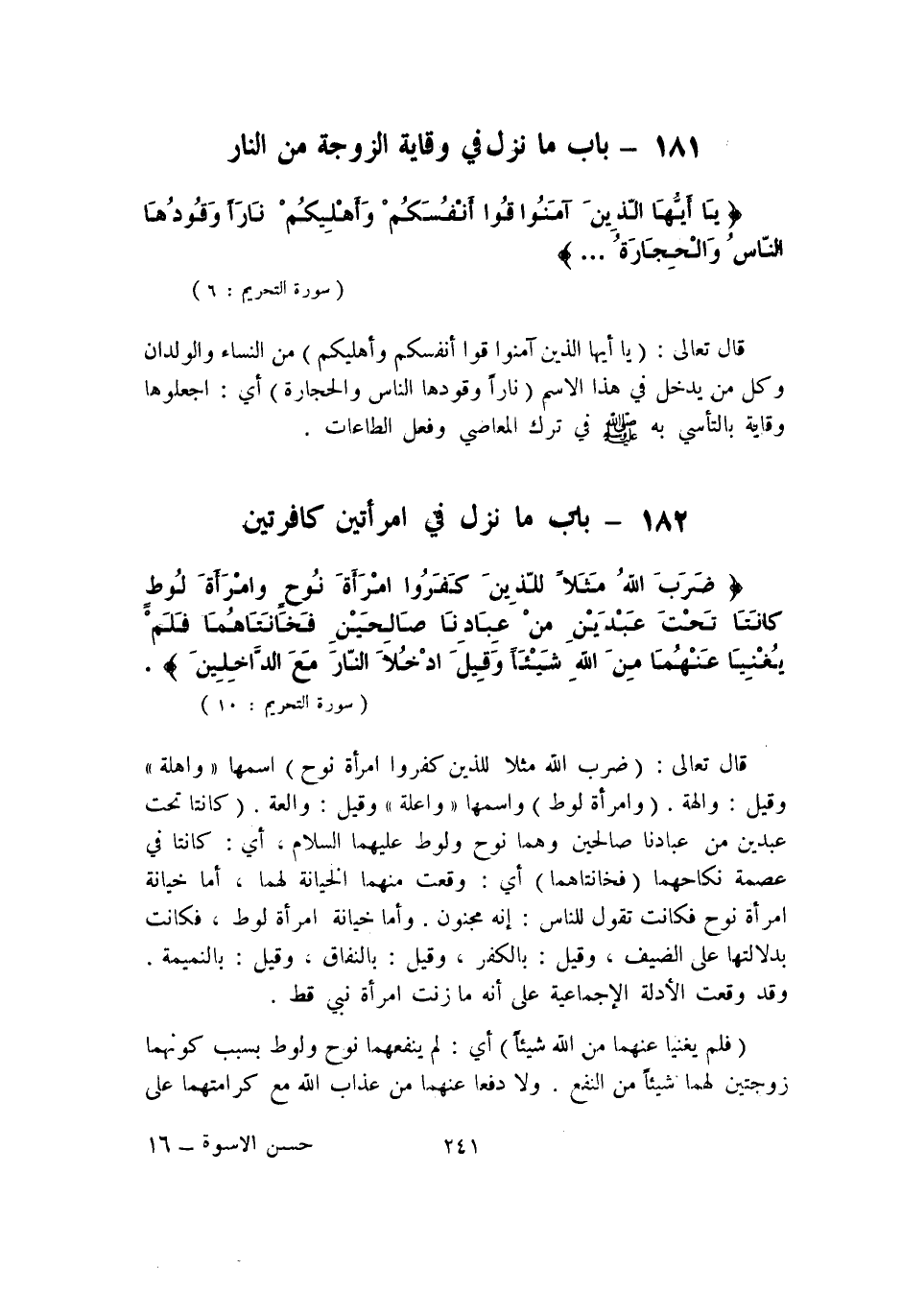 181 - بَاب مَا نزل فِي وقاية الزَّوْجَة من النَّار