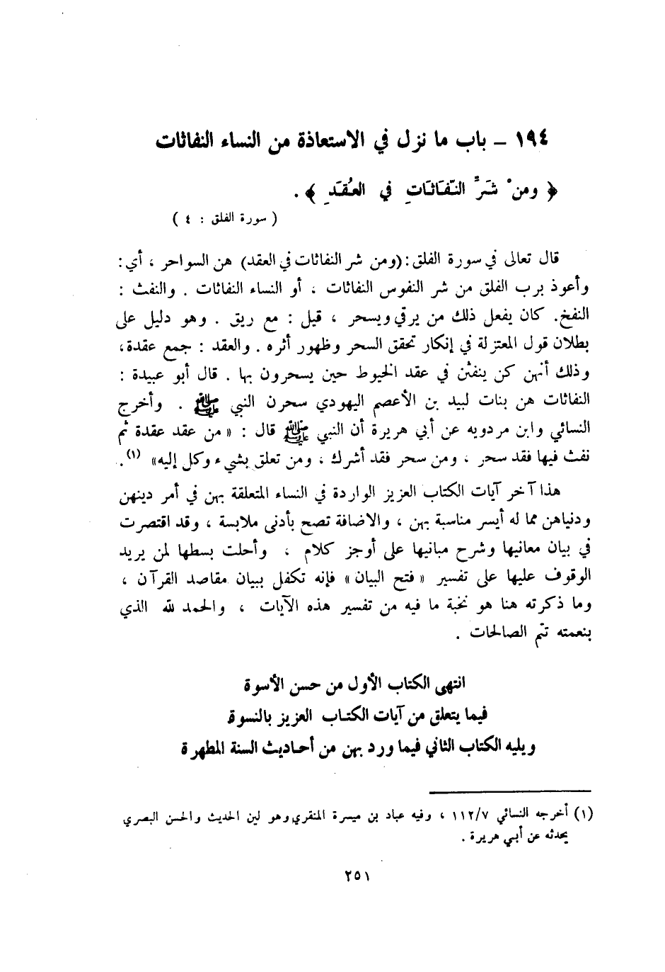 أنْتَهى الْكتاب الأول من حسن الأسوة فِيمَا يتَعَلَّق من آيَات الْكتاب الْعَزِيز بالنسوة ويليه الْكتاب الثَّانِي فِيمَا ورد بِهن من أَحَادِيث السّنة المطهرة