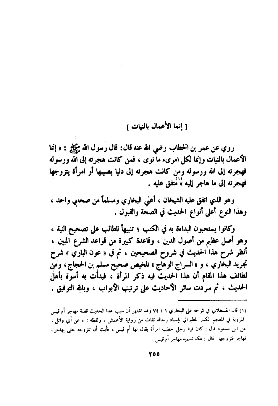 رُوِيَ عَن عمر بن الْخطاب رَضِي الله عَنهُ قَالَ قَالَ رَسُول الله صلى الله عَلَيْهِ وَسلم إِنَّمَا الْأَعْمَال بِالنِّيَّاتِ وَإِنَّمَا لكل امريء مَا نوى فَمن كَانَت هجرته إِلَى الله وَرَسُوله فَهجرَته إِلَى الله وَرَسُوله وَمن كَانَت هجرته إِلَى دنيا يُصِيبهَا أَو امْرَأَة يَتَزَوَّجهَا فَهجرَته إِلَى مَا هَاجر إِلَيْهِ مُتَّفق عَلَيْهِ وَهُوَ الَّذِي اتّفق عَلَيْهِ الشَّيْخَانِ أَعنِي البُخَارِيّ وَمُسلمًا من صَحَابِيّ وَاحِد وَهَذَا النَّوْع أَعلَى أَنْوَاع الحَدِيث فِي الصِّحَّة وَالْقَبُول