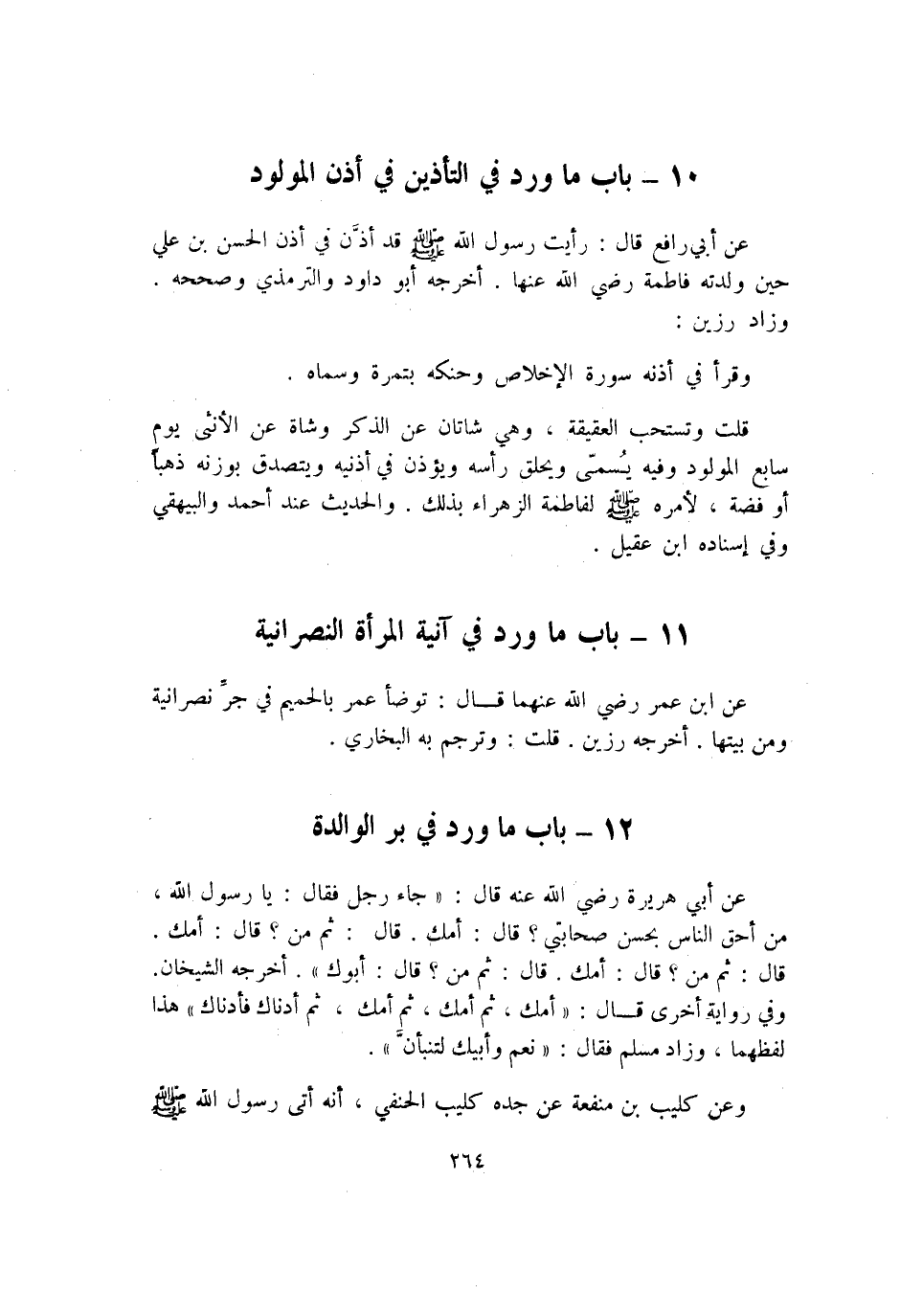 عَن أبي رَافع قَالَ رَأَيْت رَسُول الله صلى الله عَلَيْهِ وَسلم قد أذن فِي أذن الْحسن بن عَليّ حِين وَلدته فَاطِمَة رَضِي الله عَنْهَا أخرجه أَبُو دَاوُد وَالتِّرْمِذِيّ وَصَححهُ وَزَاد رزين وَقَرَأَ فِي أُذُنه سُورَة الْإِخْلَاص وحنكه بتمرة وَسَماهُ قلت وتستحب الْعَقِيقَة وَهِي شَاتَان عَن الذّكر وشَاة عَن الْأُنْثَى يَوْم سَابِع الْمَوْلُود وَفِيه يُسمى ويحلق رَأسه وَيُؤذن فِي أُذُنَيْهِ وَيتَصَدَّق بوزنه ذَهَبا أَو فضَّة لأَمره صلى الله عَلَيْهِ وَسلم لفاطمة الزهراء بذلك والْحَدِيث عِنْد أَحْمد وَالْبَيْهَقِيّ وَفِي إِسْنَاده ابْن عقيل