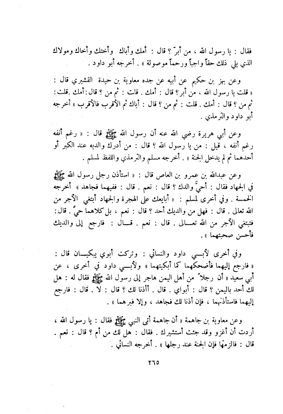 وَعَن بهز بن حَكِيم عَن أَبِيه عَن جده مُعَاوِيَة بن حيدة الْقشيرِي قَالَ قلت يَا رَسُول الله من أبر قَالَ أمك قلت ثمَّ من قَالَ أمك قلت ثمَّ من قَالَ أمك قلت ثمَّ من قَالَ أَبَاك ثمَّ الْأَقْرَب فَالْأَقْرَب أخرجه أَبُو دَاوُد وَالتِّرْمِذِيّ