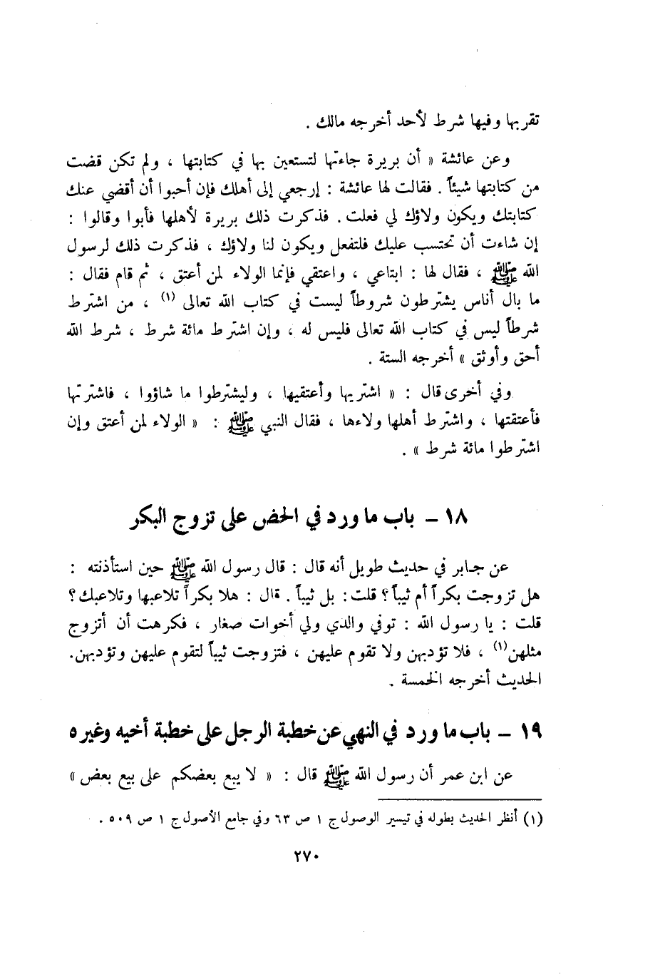 وَعَن عَائِشَة أَن بَرِيرَة جاءتها لتستعين بهَا فِي كتَابَتهَا وَلم تكن قَضَت من كتَابَتهَا شَيْئا فَقَالَت لَهَا عَائِشَة إرجعي إِلَى أهلك فَإِن أَحبُّوا أَن أَقْْضِي عَنْك كتابتك وَيكون ولاؤك لي فعلت فَذكرت ذَلِك بَرِيرَة لأَهْلهَا فَأَبَوا وَقَالُوا إِن شَاءَت أَن تحتسب عَلَيْك فلتفعل وَيكون لنا ولاءك فَذكرت ذَلِك لرَسُول الله صلى الله عَلَيْهِ وَسلم فَقَالَ لَهَا ابتاعي واعتقي فَإِنَّمَا الْوَلَاء لمن أعتق ثمَّ قَامَ فَقَالَ مَا بَال أنَاس يشترطون شُرُوطًا لَيست فِي كتاب الله تَعَالَى من اشْترط شرطا لَيْسَ فِي كتاب الله تَعَالَى فَلَيْسَ لَهُ وَإِن اشْترط مائَة شَرط شَرط الله أَحَق وأوثق أخرجه السِّتَّة وَفِي أُخْرَى قَالَ اشتريها وأعتقيها وليشترطوا مَا شاؤوا فاشترتها فأعتقتها وَاشْترط أَهلهَا ولاءها فَقَالَ النَّبِي صلى الله عَلَيْهِ وَسلم الْوَلَاء لمن أعتق وَإِن اشترطوا مائَة شَرط