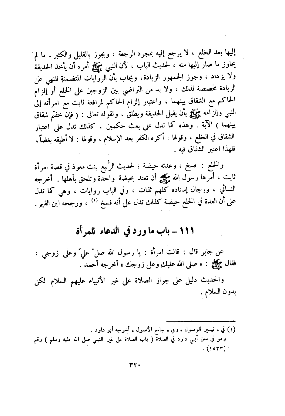 عَن جَابر قَالَ قَالَت امْرَأَة يَا رَسُول الله صل عَليّ وعَلى زَوجي فَقَالَ صلى الله عَلَيْهِ وَسلم صلى الله عَلَيْك وعَلى زَوجك أخرجه أَحْمد والْحَدِيث دَلِيل على جَوَاز الصَّلَاة على غير الْأَنْبِيَاء عَلَيْهِم السَّلَام لَكِن بِدُونِ السَّلَام