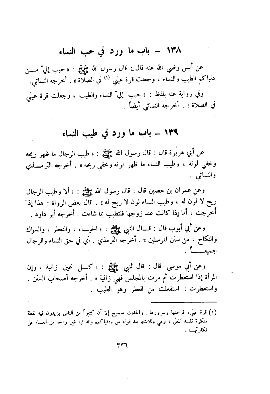 عَن أنس رَضِي الله عَنهُ قَالَ قَالَ رَسُول الله صلى الله عَلَيْهِ وَسلم حبب إِلَيّ من دنياكم الطّيب وَالنِّسَاء وَجعلت قُرَّة عَيْني فِي الصَّلَاة أخرجه النَّسَائِيّ وَفِي رِوَايَة عَنهُ بِلَفْظ حبب إِلَيّ النِّسَاء وَالطّيب وَجعلت قُرَّة عَيْني فِي الصَّلَاة أخرجه النَّسَائِيّ أَيْضا
