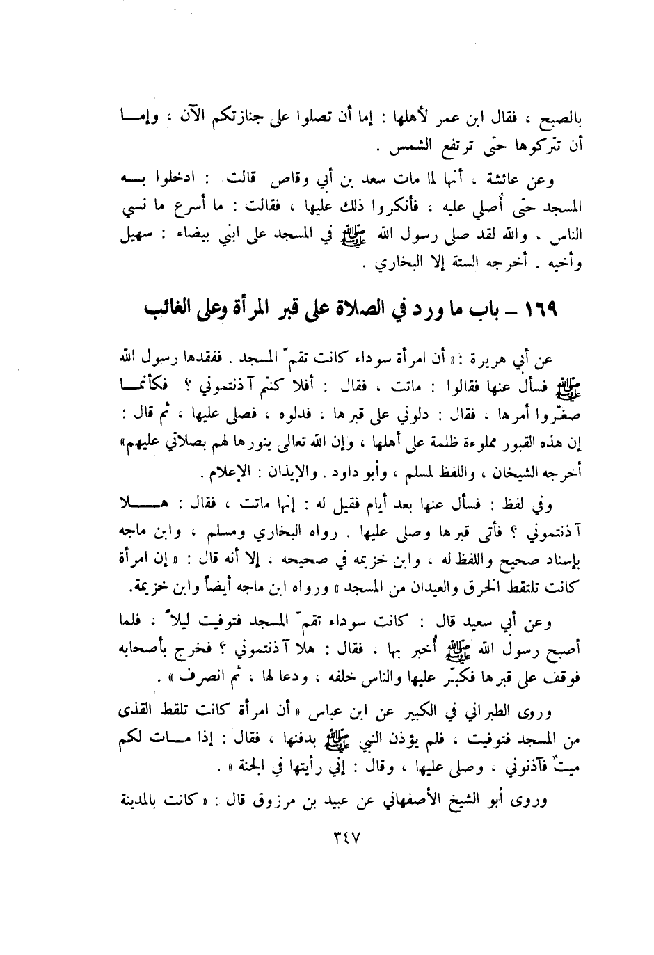 عَن أبي هُرَيْرَة أَن امْرَأَة سَوْدَاء كَانَت تقم الْمَسْجِد ففقدها رَسُول الله صلى الله عَلَيْهِ وَسلم فَسَأَلَ عَنْهَا فَقَالُوا مَاتَت فَقَالَ أَفلا كُنْتُم آذنتموني فَكَأَنَّمَا صغروا أمرهَا فَقَالَ دلوني على قبرها فدلوه فصلى عَلَيْهَا ثمَّ قَالَ إِن هَذِه الْقُبُور مَمْلُوءَة ظلمَة على أَهلهَا وَإِن الله تَعَالَى ينورها لَهُم بصلاتي عَلَيْهِم أخرجه الشَّيْخَانِ وَاللَّفْظ لمُسلم وَأَبُو دَاوُد والإيذان الْإِعْلَام