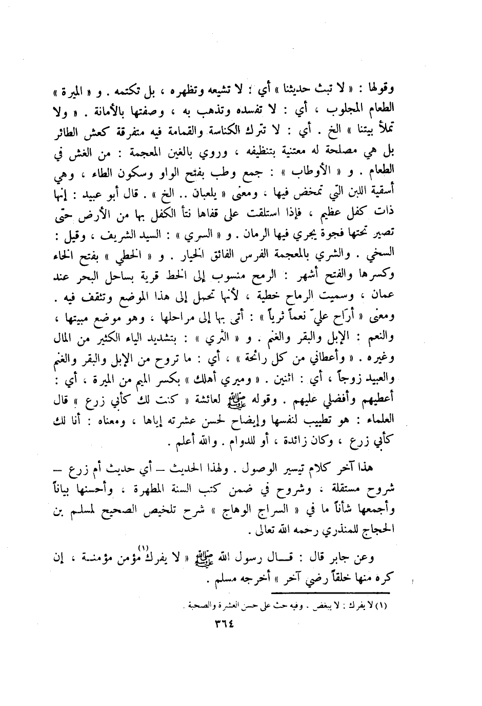 364 - @ وَقَوْلها لَا تبث حديثنا أَي لَا تشيعه وتظهره بل تكتمه والميرة الطَّعَام المجلوب أَي لَا تفسده وَتذهب بِهِ وصفتها بالأمانة وَلَا تملأ بيتنا الخ أَي لَا تتْرك الكناسة وَالْقُمَامَة فِيهِ مُتَفَرِّقَة كعش الطَّائِر بل هِيَ مصلحَة لَهُ معتنية بتنظيفه وَرُوِيَ بالغين الْمُعْجَمَة من الْغِشّ فِي الطَّعَام والأوطاب جمع وطب بِفَتْح الْوَاو وَسُكُون الطَّاء وَهِي أسقية اللَّبن الَّتِي تمخض فِيهَا وَمعنى يلعبان الخ قَالَ أَبُو عبيد إِنَّهَا ذَات كفل عَظِيم فَإِذا استلقت على قفاها نتأ الكفل بهَا من الأَرْض حَتَّى تصير تحتهَا فجوة يجْرِي فِيهَا الرُّمَّان وَالسري السَّيِّد الشريف وَقيل السخي والشري بِالْمُعْجَمَةِ الْفرس الْفَائِق الْخِيَار والخطي بِفَتْح الْخَاء وَكسرهَا وَالْفَتْح أشهر الرمْح مَنْسُوب إِلَى الْخط قَرْيَة بساحل الْبَحْر عِنْد عمان وَسميت الرماح خطية لِأَنَّهَا تحمل إِلَى هَذَا الْموضع وتثقف فِيهِ وَمعنى أراح عَليّ نعما ثريا أَتَى بهَا إِلَى مراحلها وَهُوَ مَوضِع مبيتها وَالنعَم الْإِبِل وَالْبَقر وَالْغنم والثري بتَشْديد الْيَاء الْكثير من المَال وَغَيره وَأَعْطَانِي من كل رَائِحَة أَي مَا تروح من الأبل وَالْبَقر وَالْغنم وَالْعَبِيد زوجا أَي اثْنَيْنِ وميري أهلك بِكَسْر الْمِيم من الْميرَة أَي أعطيهم وأفضلي عَلَيْهِم وَقَوله صلى الله عَلَيْهِ وَسلم لعَائِشَة كنت لَك كَأبي زرع قَالَ الْعلمَاء هُوَ تطييب لنَفسهَا وإيضاح لحسن عشرته إِيَّاهَا وَمَعْنَاهُ أَنا لَك كَأبي زرع وَكَانَ زَائِدَة أَو للدوام وَالله أعلم