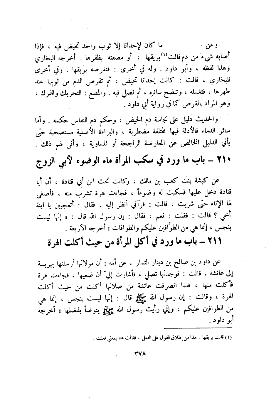 عَن كَبْشَة بنت كَعْب بن مَالك وَكَانَت تَحت ابْن أبي قَتَادَة أَن أَبَا قَتَادَة دخل عَلَيْهَا فَسَكَبت لَهُ وضُوءًا فَجَاءَت هرة تشرب مِنْهُ فأصغى لَهَا الْإِنَاء حَتَّى شربت قَالَت فرآني أنظر إِلَيْهِ فَقَالَ أَتَعْجَبِينَ يَا ابْنة أخي قَالَت فَقلت نعم فَقَالَ إِن رَسُول الله قَالَ إِنَّهَا لَيست بِنَجس إِنَّمَا هِيَ من الطوافين عَلَيْكُم والطوافات أخرجه الْأَرْبَعَة