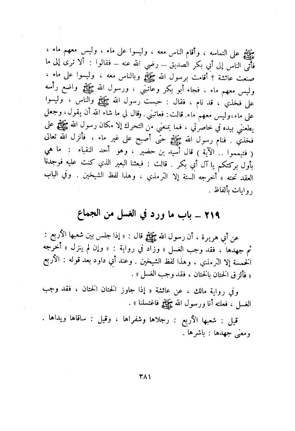 صلى الله عَلَيْهِ وَسلم على التماسه وَأقَام النَّاس مَعَه وَلَيْسوا على مَاء وَلَيْسَ مَعَهم مَاء فَأتى النَّاس إِلَى أبي بكر الصّديق رَضِي الله عَنهُ فَقَالُوا أَلا ترى إِلَى مَا صنعت عَائِشَة أَقَامَت برَسُول الله صلى الله عَلَيْهِ وَسلم وبالناس مَعَه وَلَيْسوا على مَاء وَلَيْسَ مَعَهم مَاء فجَاء أَبُو بكر وعاتبني وَرَسُول الله صلى الله عَلَيْهِ وَسلم وَاضع رَأسه على فَخذي قد نَام فَقَالَ حبست رَسُول الله صلى الله عَلَيْهِ وَسلم وَالنَّاس وَلَيْسوا على مَاء وَلَيْسَ مَعَهم مَاء قَالَت فعاتبني وَقَالَ لي مَا شَاءَ الله أَن يَقُول وَجعل يطعنني بِيَدِهِ فِي خاصرتي فَمَا يَمْنعنِي من التحرك إِلَّا مَكَان رَسُول الله صلى الله عَلَيْهِ وَسلم على فَخذي فَنَامَ رَسُول الله صلى الله عَلَيْهِ وَسلم حَتَّى أصبح على غير مَاء فَأنْزل الله تَعَالَى {فَتَيَمَّمُوا} الْآيَة قَالَ أسيد بن حضير وَهُوَ أحد النُّقَبَاء مَا هِيَ بِأول بركتكم يَا آل أبي بكر قَالَت فَبَعَثنَا الْبَعِير الَّذِي كنت عَلَيْهِ فَوَجَدنَا العقد تَحْتَهُ أخرجه السِّتَّة إِلَّا التِّرْمِذِيّ وَهَذَا لفظ الشَّيْخَيْنِ وَفِي الْبَاب رِوَايَات بألفاظه