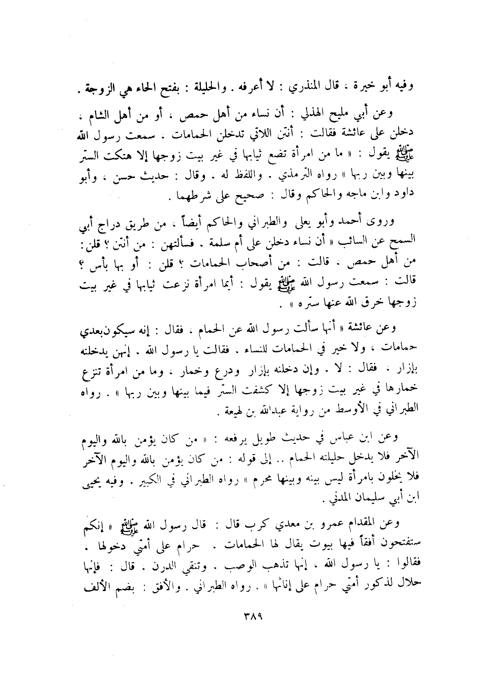 وَعَن أبي مليح الْهُذلِيّ أَن نسَاء من أهل حمص أَو من أهل الشَّام دخلن على عَائِشَة فَقَالَت أنتن اللَّاتِي تدخلن الحمامات سَمِعت رَسُول الله صلى الله عَلَيْهِ وَسلم يَقُول مَا من امْرَأَة تضع ثِيَابهَا فِي غير بَيت زَوجهَا إِلَّا هتكت السّتْر بَينهَا وَبَين رَبهَا رَوَاهُ التِّرْمِذِيّ وَاللَّفْظ لَهُ وَقَالَ حَدِيث حسن وَأَبُو دَاوُد وَابْن مَاجَه وَالْحَاكِم وَقَالَ صَحِيح على شَرطهمَا