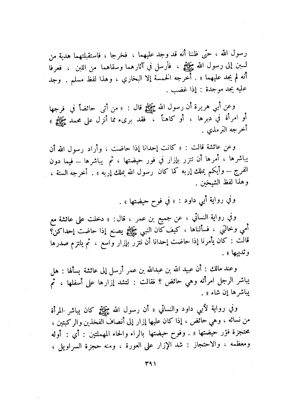 وَعَن عَائِشَة قَالَت كَانَت إحدانا إِذا حَاضَت وَأَرَادَ رَسُول الله أَن يُبَاشِرهَا أمرهَا أَن تتزر بإزار فِي فَور حَيْضَتهَا ثمَّ يُبَاشِرهَا فِيمَا دون الْفرج وَأَيكُمْ يملك إربه كَمَا كَانَ رَسُول الله يملك إربه أخرجه السِّتَّة وَهَذَا لفظ الشَّيْخَيْنِ