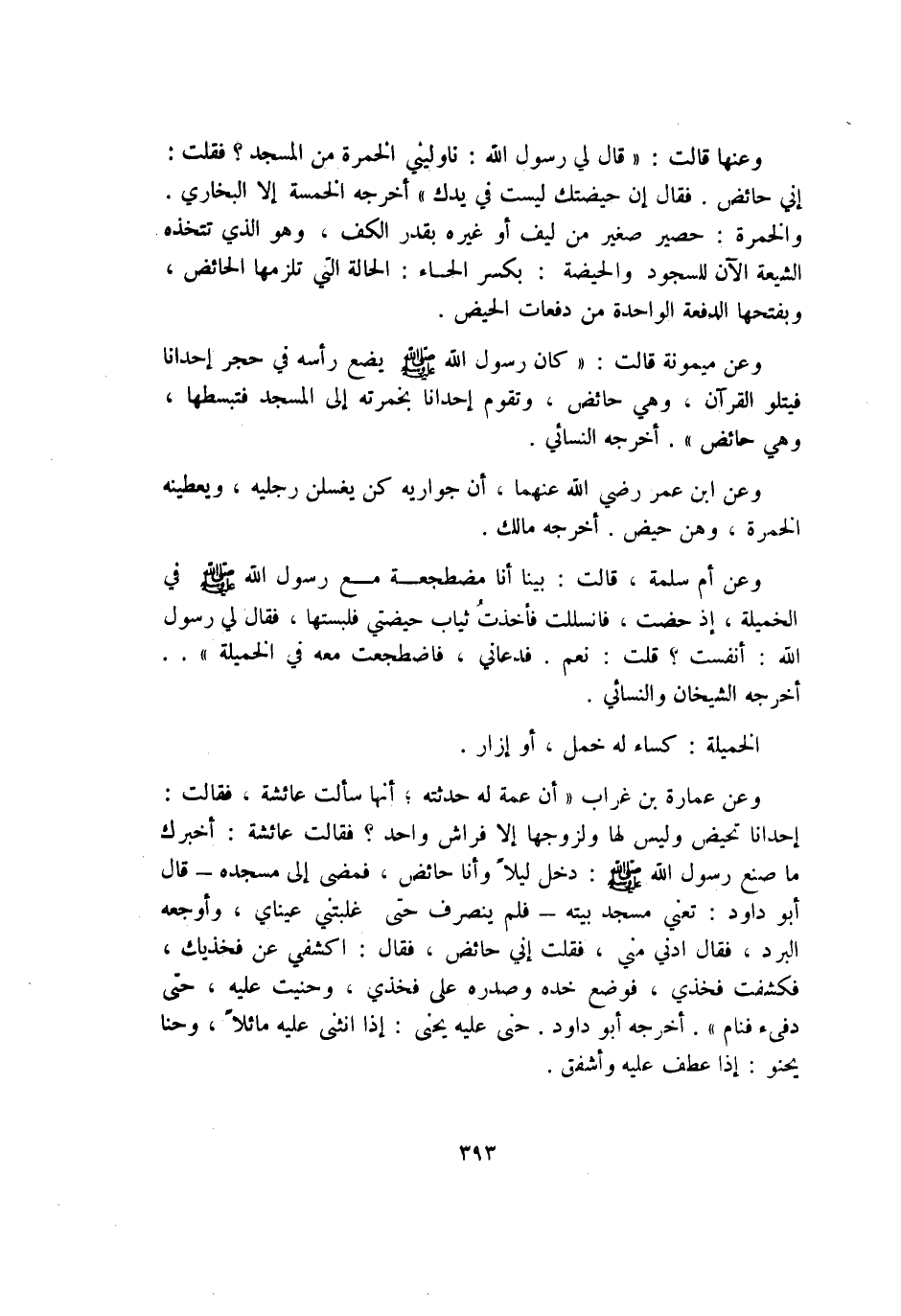 وعنها قَالَت قَالَ لي رَسُول الله ناوليني الْخمْرَة من الْمَسْجِد فَقلت إِنِّي حَائِض فَقَالَ إِن حيضتك لَيست فِي يدك أخرجه الْخَمْسَة إِلَّا البُخَارِيّ والخمرة حَصِير صَغِير من لِيف أَو غَيره بِقدر الْكَفّ وَهُوَ الَّذِي تتخذه الشِّيعَة الْآن للسُّجُود والحيضة بِكَسْر الْحَاء الْحَالة الَّتِي تلزمها الْحَائِض وَبِفَتْحِهَا الدفعة الْوَاحِدَة من دفعات الْحيض