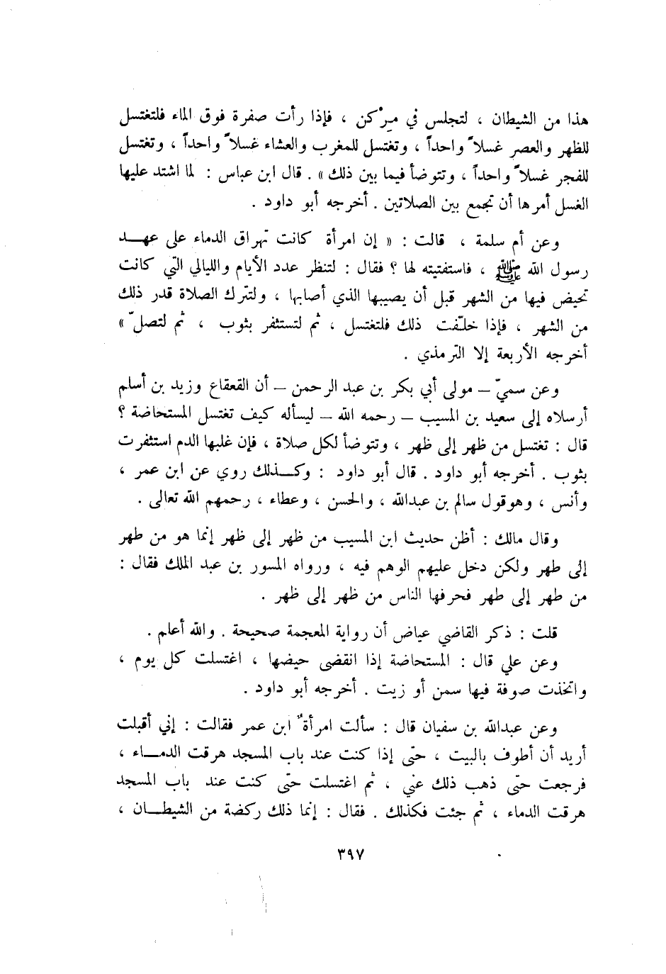 وَعَن سمي مولى أبي بكر بن عبد الرَّحْمَن أَن الْقَعْقَاع وَزيد بن أسلم أَرْسلَاهُ إِلَى سعيد بن الْمسيب رَحمَه الله ليسأله كَيفَ تَغْتَسِل الْمُسْتَحَاضَة قَالَ تَغْتَسِل من ظهر إِلَى ظهر وتتوضأ لكل صَلَاة فَإِن غلبها الدَّم استثفرت بِثَوْب أخرجه أَو دَاوُد قَالَ أَبُو دَاوُد وَكَذَلِكَ رُوِيَ عَن ابْن عمر وَأنس وَهُوَ قَول سَالم بن عبد الله وَالْحسن وَعَطَاء رَحِمهم الله تَعَالَى