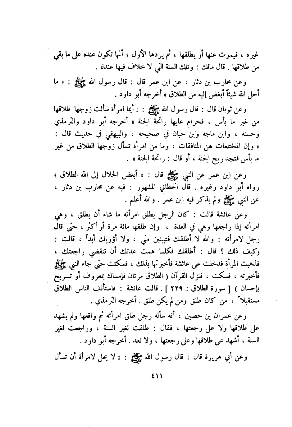 وَعَن ابْن عمر عَن النَّبِي صلى الله عَلَيْهِ وَسلم قَالَ أبْغض الْحَلَال إِلَى الله الطَّلَاق رَوَاهُ أَبُو دَاوُد وَغَيره قَالَ الْخطابِيّ الْمَشْهُور فِيهِ عَن محَارب بن دثار عَن النَّبِي صلى الله عَلَيْهِ وَسلم وَلم يذكر فِيهِ ابْن عمر وَالله أعلم