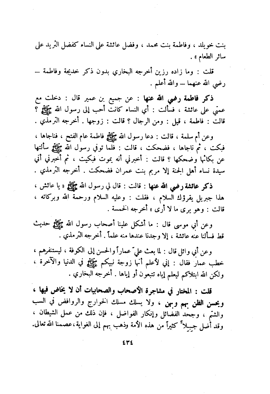 قلت الْمُخْتَار فِي مشاجرة الْأَصْحَاب والصحابيات أَن لَا يخاض فِيهَا وَيحسن الظَّن بهم وبهن وَلَا يسْلك مَسْلَك الْخَوَارِج وَالرَّوَافِض فِي السب والشتم وَجحد الْفَضَائِل وإنكار الفواضل فَإِن ذَلِك من عمل الشَّيْطَان وَقد أضلّ جبلا كثيرا من هَذِه الْأمة وَذهب بهم إِلَى الغواية عصمنا الله تَعَالَى