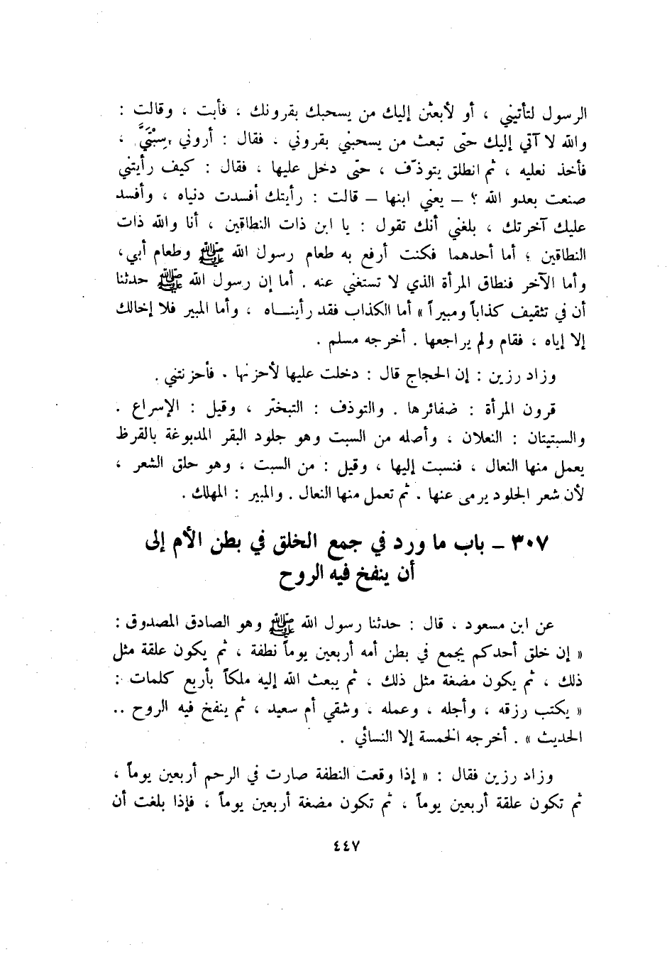 عَن ابْن مَسْعُود قَالَ حَدثنَا رَسُول الله صلى الله عَلَيْهِ وَسلم وَهُوَ الصَّادِق المصدوق إِن خلق أحدكُم يجمع فِي بطن أمه أَرْبَعِينَ يَوْمًا نُطْفَة ثمَّ يكون علقَة مثل ذَلِك ثمَّ يكون مُضْغَة مثل ذَلِك ثمَّ يبْعَث الله إِلَيْهِ ملكا بِأَرْبَع كَلِمَات يكْتب رزقه وأجله وَعَمله وشقي أم سعيد ثمَّ ينْفخ فِيهِ الرّوح الحَدِيث أخرجه الْخَمْسَة إِلَّا النَّسَائِيّ وَزَاد رزين فَقَالَ إِذا وَقعت النُّطْفَة صَارَت فِي الرَّحِم أَرْبَعِينَ يَوْمًا ثمَّ تكون علقَة أَرْبَعِينَ يَوْمًا ثمَّ تكون مُضْغَة أَرْبَعِينَ يَوْمًا فَإِذا بلغت أَن