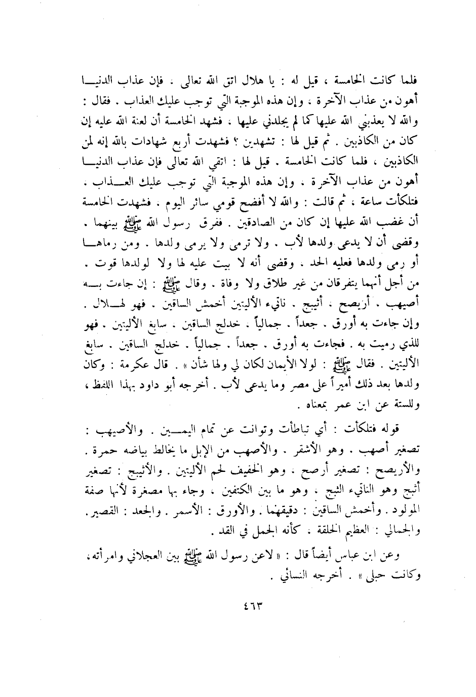 فَلَمَّا كَانَت الْخَامِسَة قيل لَهُ يَا هِلَال اتَّقِ الله تَعَالَى فَإِن عَذَاب الدُّنْيَا أَهْون من عَذَاب الْآخِرَة وَإِن هَذِه الْمُوجبَة الَّتِي توجب عَلَيْك الْعَذَاب فَقَالَ وَالله لَا يُعَذِّبنِي الله عَلَيْهَا كَمَا لم يجلدني عَلَيْهَا فَشهد الْخَامِسَة أَن لعنة الله عَلَيْهِ إِن كَانَ من الْكَاذِبين ثمَّ قيل لَهَا تشهدين فَشَهِدت أَربع شَهَادَات بِاللَّه إِنَّه لمن الْكَاذِبين فَلَمَّا كَانَت الْخَامِسَة قيل لَهَا اتقِي الله تَعَالَى فَإِن عَذَاب الدُّنْيَا أَهْون من عَذَاب الْآخِرَة وَإِن هَذِه الْمُوجبَة الَّتِي توجب عَلَيْك الْعَذَاب فتلكأت سَاعَة ثمَّ قَالَت وَالله لَا أفضح قومِي سَائِر الْيَوْم فَشَهِدت الْخَامِسَة أَن غضب الله عَلَيْهَا إِن كَانَ من الصَّادِقين فَفرق رَسُول الله صلى الله عَلَيْهِ وَسلم بَينهمَا وَقضى أَن لَا يدعى وَلَدهَا لأَب وَلَا ترمى وَلَا يرْمى وَلَدهَا وَمن رَمَاهَا أَو رمى وَلَدهَا فَعَلَيهِ الْحَد وَقضى أَنه لَا بَيت عَلَيْهِ لَهَا وَلَا لولدها قوت من أجل أَنَّهُمَا يتفرقان من غير طَلَاق وَلَا وَفَاة وَقَالَ صلى الله عَلَيْهِ وَسلم إِن جَاءَت بِهِ أُصَيْهِب أَي أريصح أثيبج ناتيء الأليتين أخمش السَّاقَيْن فَهُوَ لهِلَال وَإِن جَاءَت بِهِ أَوْرَق جَعدًا جمالِيًّا خَدلج السَّاقَيْن سابغ الأليتين فَهُوَ للَّذي رميت بِهِ فَجَاءَت بِهِ أَوْرَق جَعدًا جمالِيًّا خَدلج السَّاقَيْن سابغ الأليتين فَقَالَ صلى الله عَلَيْهِ وَسلم لَوْلَا الْأَيْمَان لَكَانَ لي وَلها شَأْن قَالَ عِكْرِمَة وَكَانَ وَلَدهَا بعد ذَلِك أَمِيرا على مصر وَمَا يدعى لأَب أخرجه أَبُو دَاوُد بِهَذَا اللَّفْظ وللستة عَن ابْن عمر بِمَعْنَاهُ