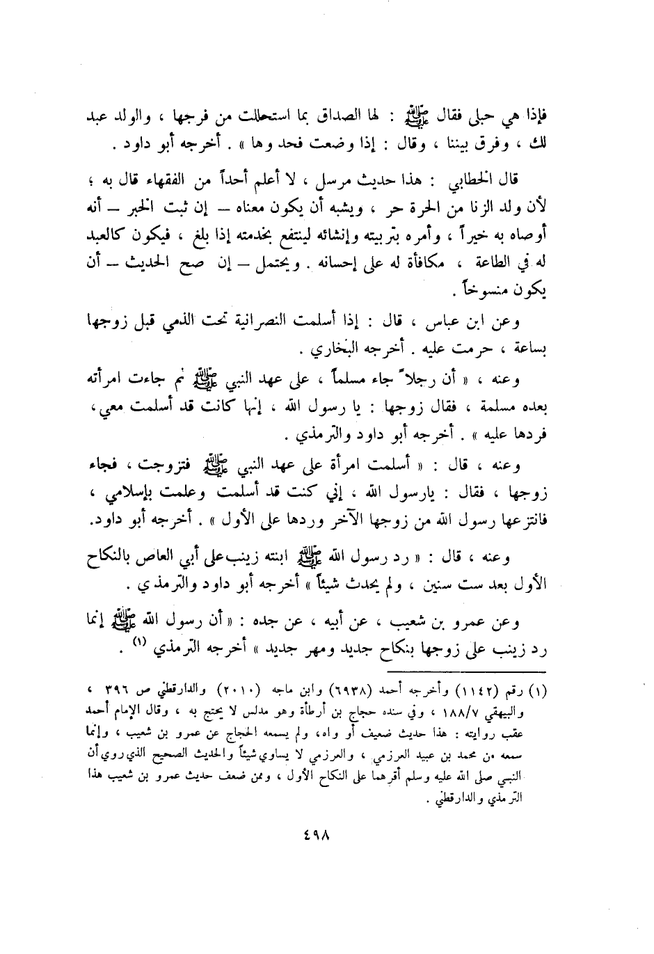 وَعنهُ قَالَ رد رَسُول الله صلى الله عَلَيْهِ وَسلم ابْنَته زَيْنَب على أبي الْعَاصِ بِالنِّكَاحِ الأول بعد سِتّ سِنِين وَلم يحدث شَيْئا أخرجه أَبُو دَاوُد وَالتِّرْمِذِيّ