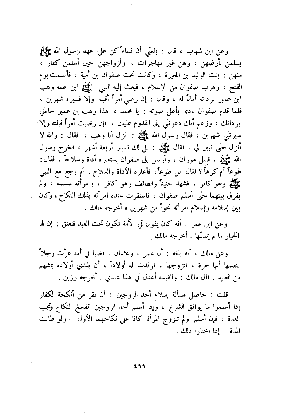 وَعَن ابْن شهَاب قَالَ بَلغنِي أَن نسَاء كن على عهد رَسُول الله صلى الله عَلَيْهِ وَسلم يسلمن بأرضهن وَهن غير مهاجرات وأزواجهن حِين أسلمن كفار مِنْهُنَّ بنت الْوَلِيد بن الْمُغيرَة وَكَانَت تَحت صَفْوَان بن أُميَّة فَأسْلمت يَوْم الْفَتْح وهرب صَفْوَان من الْإِسْلَام فَبعث إِلَيْهِ النَّبِي صلى الله عَلَيْهِ وَسلم ابْن عَمه وهب ابْن عُمَيْر بردائه أَمَانًا لَهُ وَقَالَ إِن رَضِي أمرا أقبله وَإِلَّا فسيره شَهْرَيْن فَلَمَّا قدم صَفْوَان نَادَى بِأَعْلَى صَوته يَا مُحَمَّد هَذَا وهب بن عُمَيْر جَاءَنِي بردائك وَزعم أَنَّك دعوتني إِلَى الْقدوم عَلَيْك فَإِن رضيت أمرا قبلته وَإِلَّا سيرتني شَهْرَيْن فَقَالَ رَسُول الله صلى الله عَلَيْهِ وَسلم انْزِلْ أَبَا وهب فَقَالَ وَالله لَا أنزل حَتَّى تبين لي فَقَالَ صلى الله عَلَيْهِ وَسلم بل لَك تسيير أَرْبَعَة أشهر فَخرج رَسُول الله صلى الله عَلَيْهِ وَسلم قبل هوزان وَأرْسل إِلَى صَفْوَان يستعيره أَدَاة وسلاحا فَقَالَ طَوْعًا أم كرها فَقَالَ بل طَوْعًا فأعاره الأداة وَالسِّلَاح ثمَّ رَجَعَ مَعَ النَّبِي صلى الله عَلَيْهِ وَسلم وَهُوَ كَافِر فَشهد حنينا والطائف وَهُوَ كَافِر وَامْرَأَته مسلمة وَلم يفرق بَينهمَا حَتَّى أسلم صَفْوَان فاستقرت عِنْده امْرَأَته بذلك النِّكَاح وَكَانَ بَين إِسْلَامه وَإِسْلَام امْرَأَته نَحوا من شَهْرَيْن أخرجه مَالك