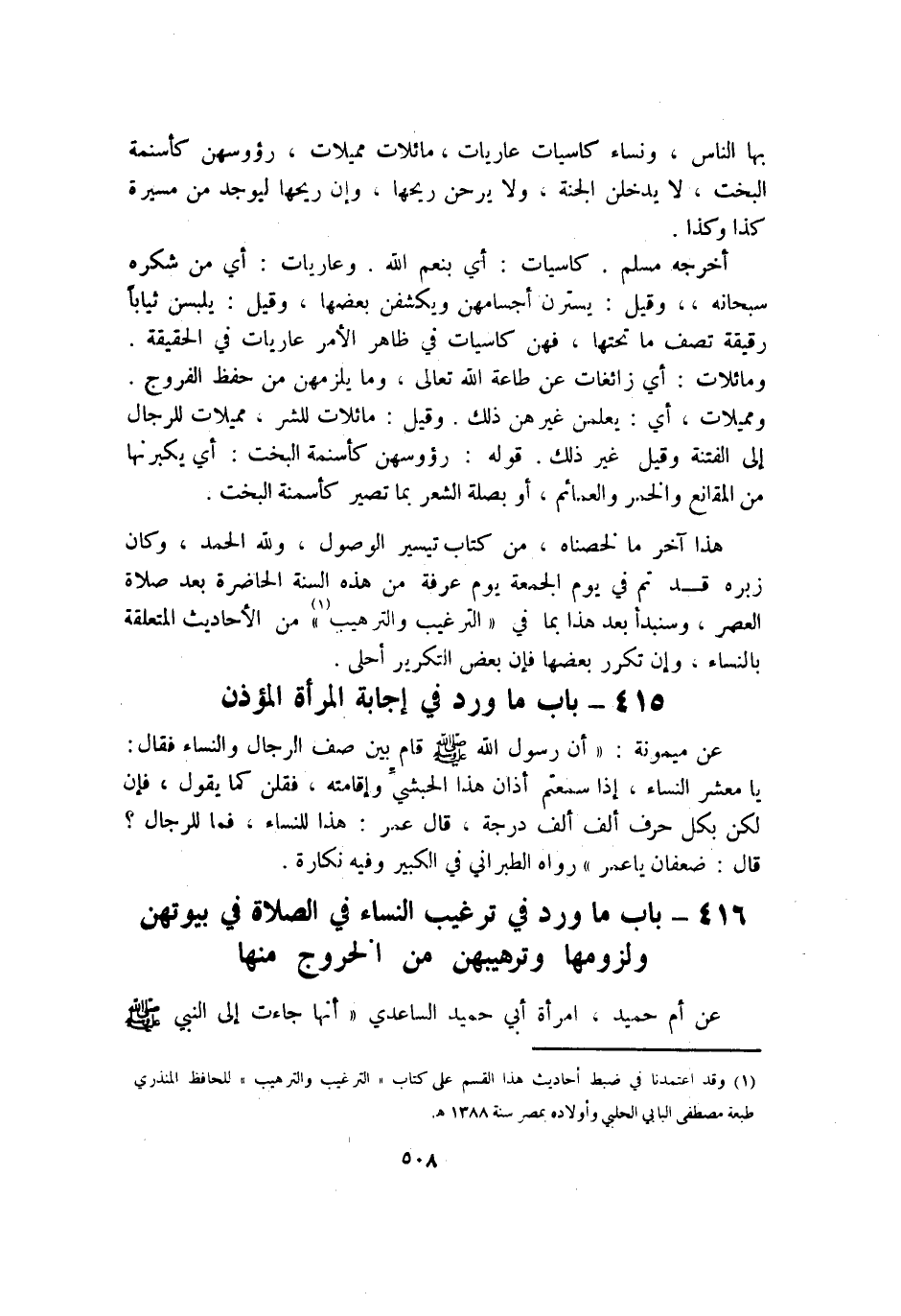 416 - بَاب مَا ورد فِي ترغيب النِّسَاء فِي الصَّلَاة فِي بُيُوتهنَّ ولزومها وترهيبهن من الْخُرُوج مِنْهَا