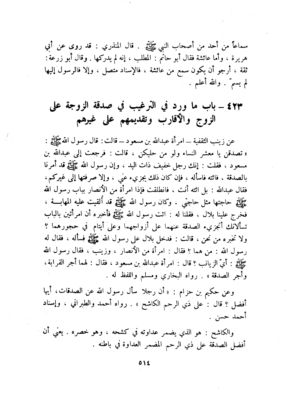 423 - بَاب مَا ورد فِي التَّرْغِيب فِي صَدَقَة الزَّوْجَة على الزَّوْج والأقارب وتقديمهم على غَيرهم