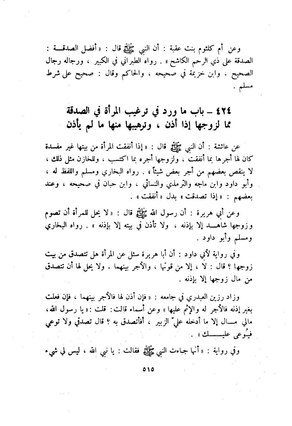 424 - بَاب مَا ورد فِي ترغيب الْمَرْأَة فِي الصَّدَقَة مِمَّا لزَوجهَا إِذا أذن وترهيبها مِنْهَا مَا لم يَأْذَن